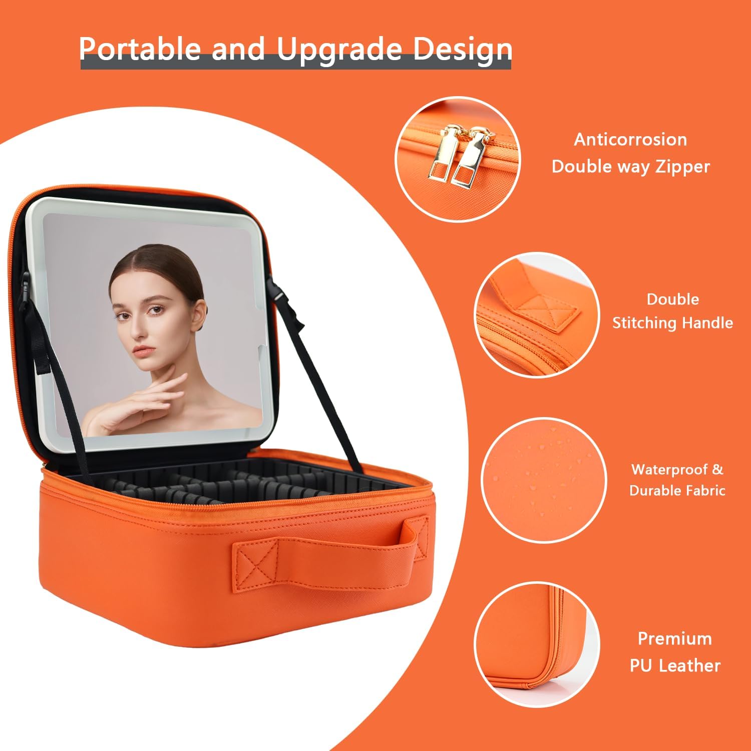 Makeup Bag with Led Mirror,Travel Makeup Organizer with 3 Color Setting, Portable Storage and Adjustable Dividers Travel Makeup Bag(Orange)