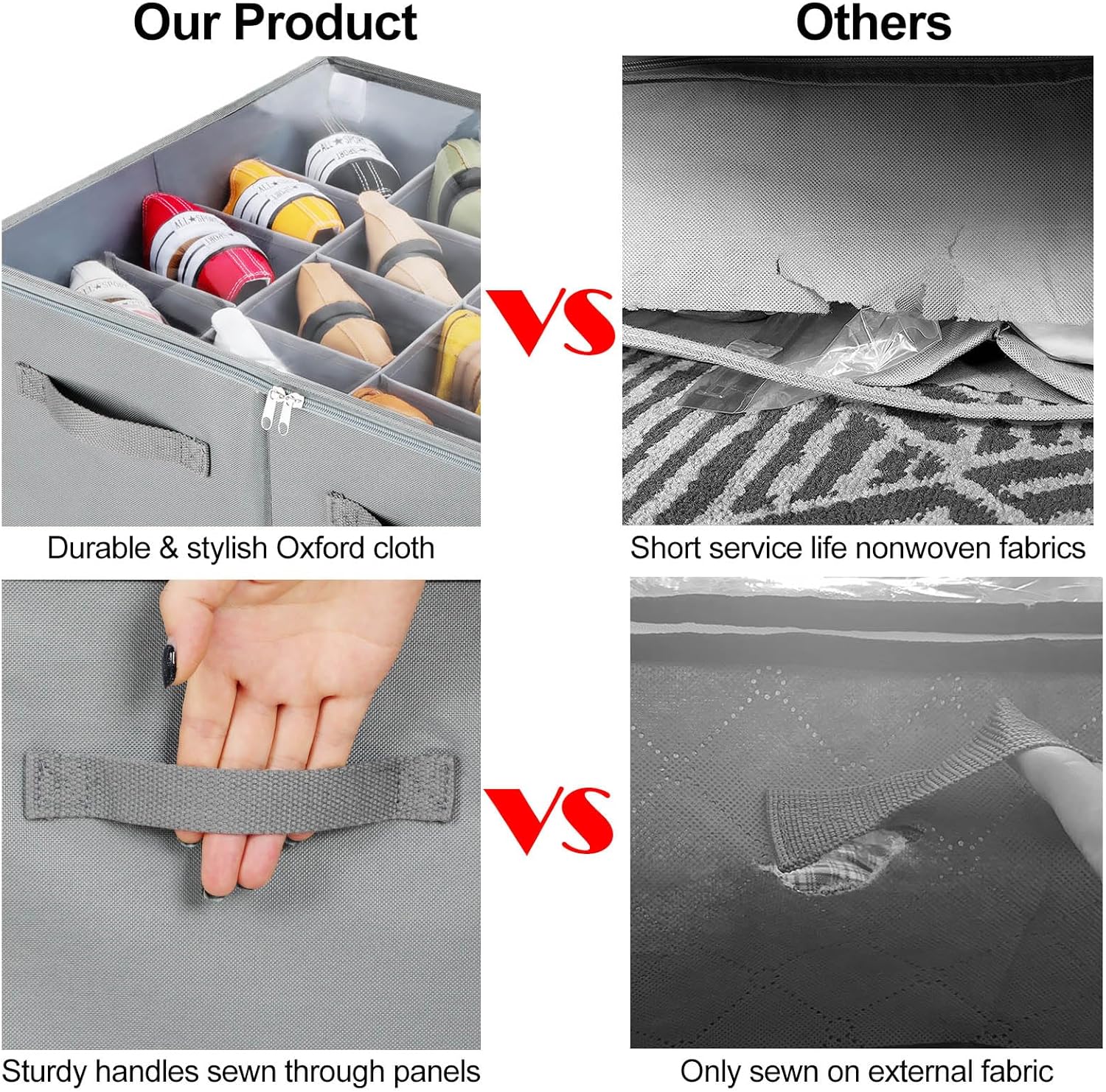 - Durable Materials & High-Quality: High quality Oxford fabric is more durable and stylish compared to non-woven fabrics. The reinforced side boards and inserted bottom ensure that shoe box can maintain its shape even under pulling or other pressure, and will not collapse when empty or full. The reinforced handles allow you to easily remove shoe bin from closet, shelves ect. With no handles on the back to avoid occupying space when placed against the cabinet wall