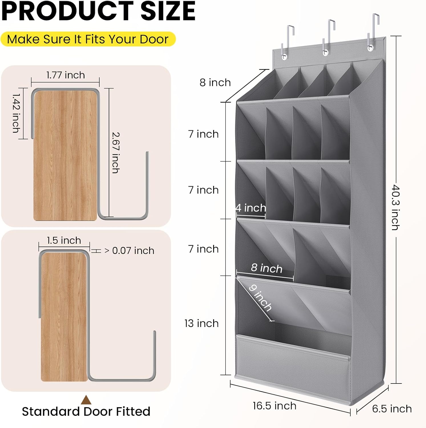 - 5-Second Hassle-Free Setup: Simply hang the organizer with the included dual-sized hooks (fits most doors) or mount it on walls with nails (screws not included). No tools needed—start organizing in seconds.