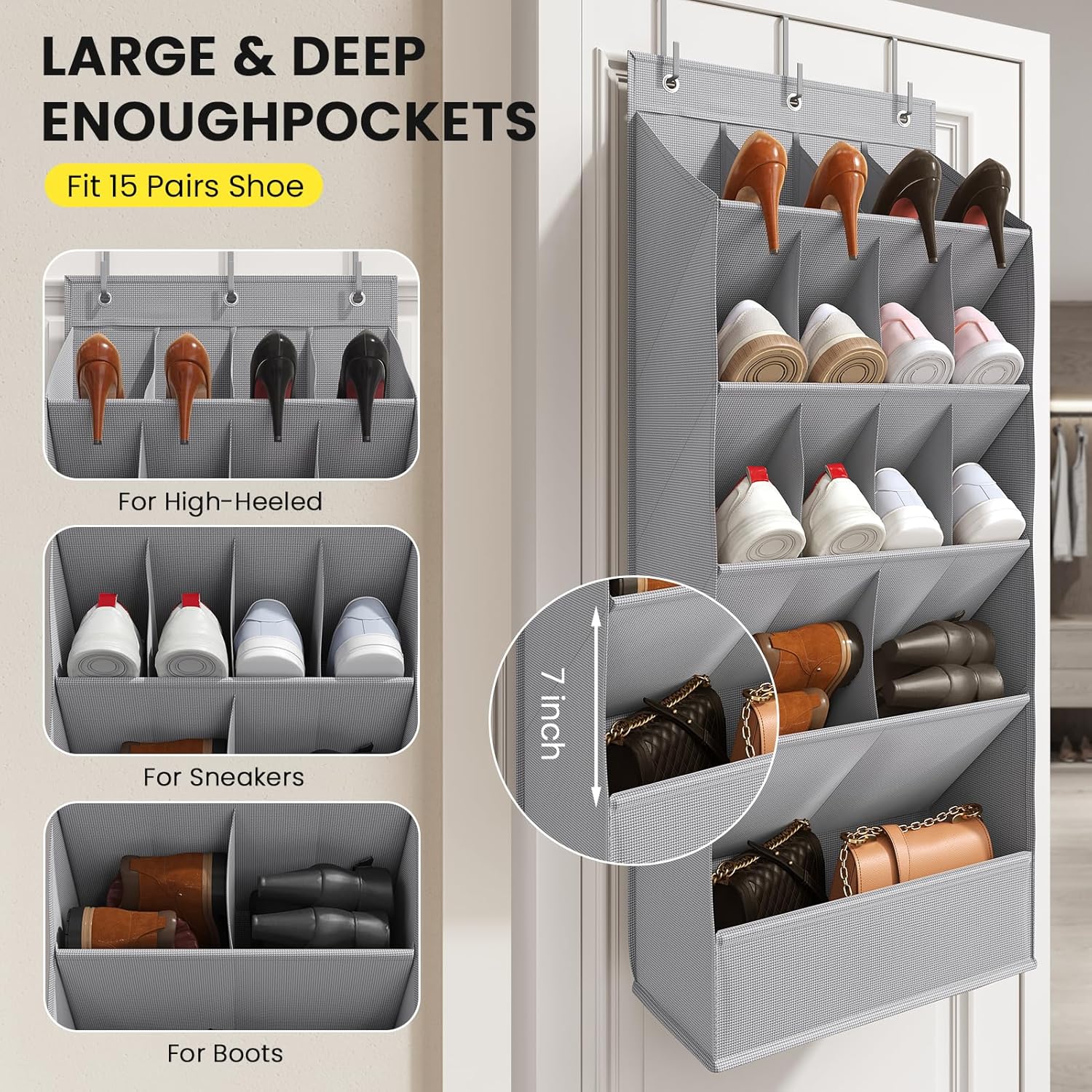 - 15 Extra-Large & Deep Compartments: Our over-the-door shoe organizer features 12 spacious compartments, 2 oversized pockets, and 1 jumbo-sized pocket—designed to hold 15-20 pairs of shoes. Effortlessly store bulky size 12+ boots, heels, sandals, or flip-flops. Offers 20% more capacity than standard organizers