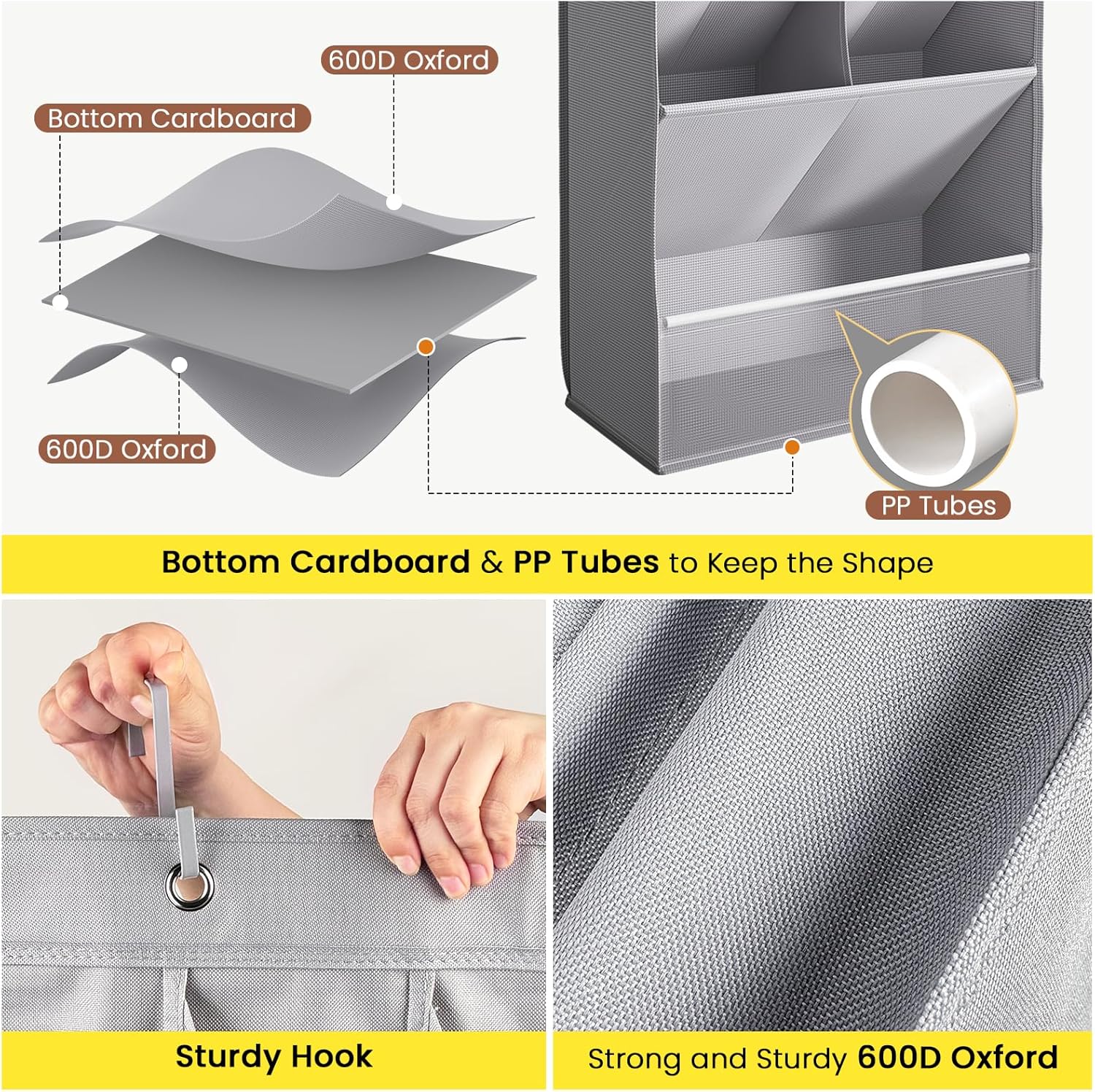 - Premium Oxford Fabric & Heavy-Duty Support: Unlike flimsy plastic or mesh organizers, ours is crafted with tear-resistant 600D Oxford fabric for long-lasting durability. Reinforced with 5mm-thick PP plastic tubes and a sturdy cardboard base to prevent sagging, bending, or collapsing—even when fully loaded