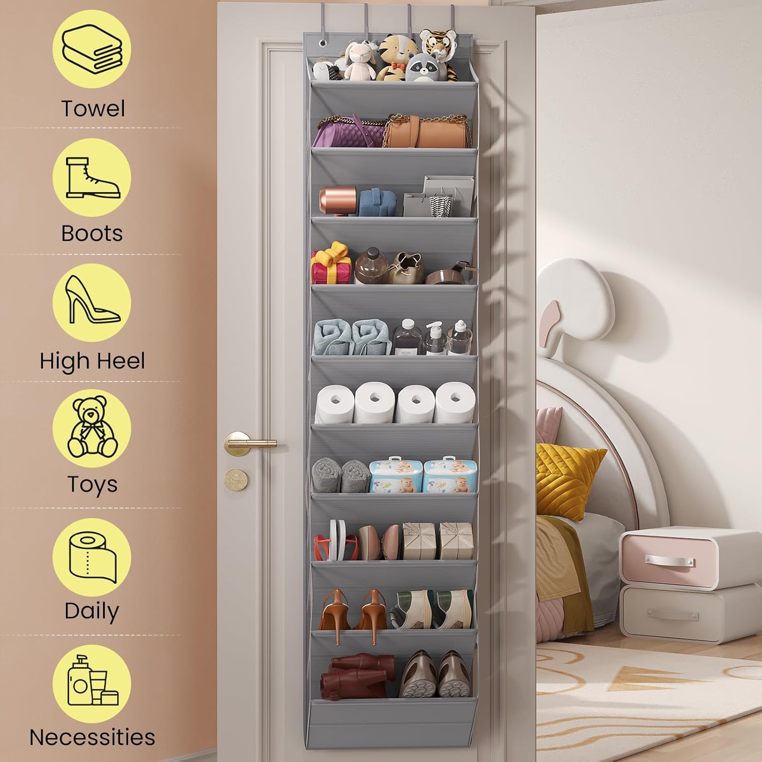 - 10 Tier Extra-Large & Deep Compartments: Our over-the-door shoe organizer features 10 Tier large and deep pockets, designed to hold 20-40 pairs of shoes. Effortlessly store 20 bulky size 12+ boots, heels, sandals, or flip-flops. Offers 40% more capacity than standard organizers