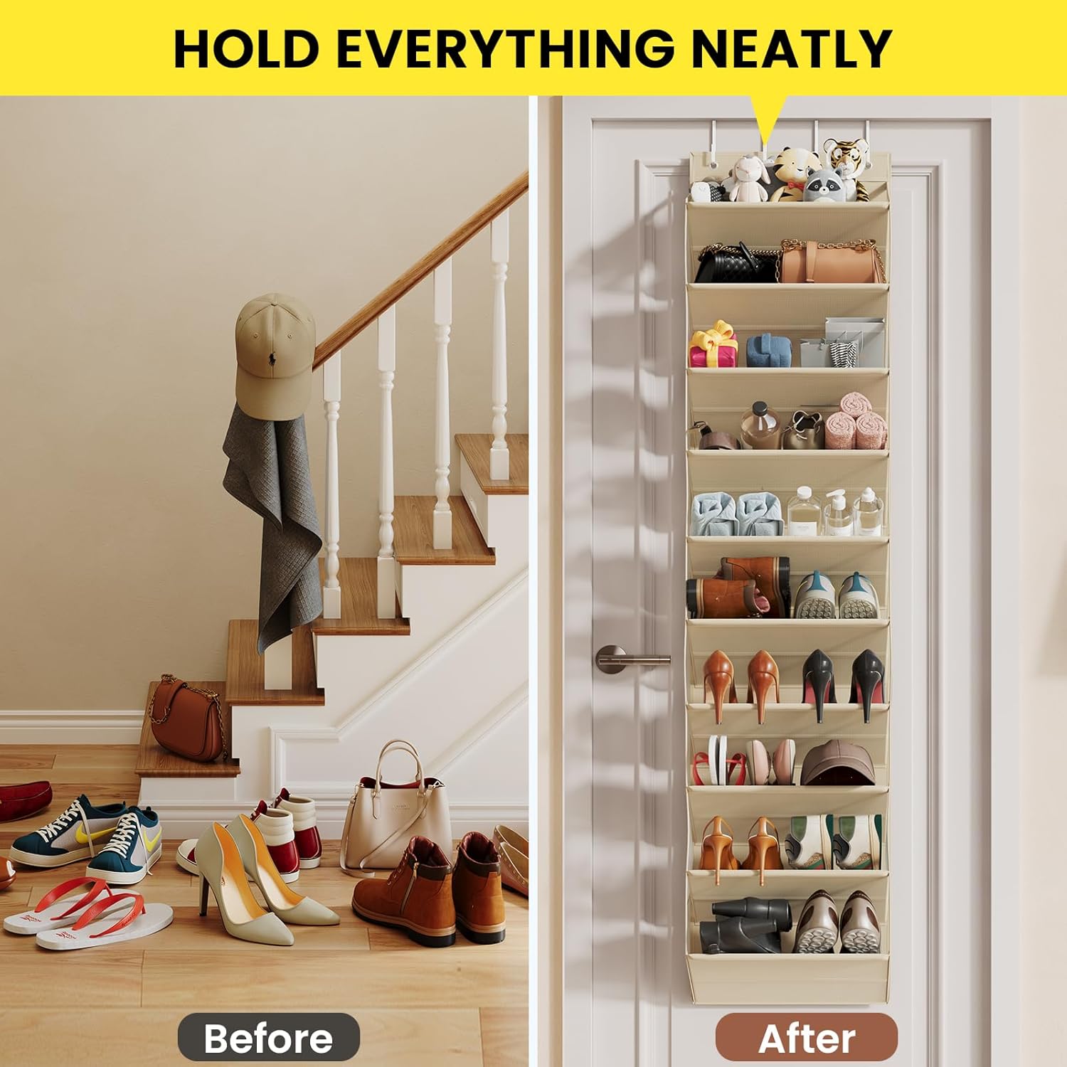 - 5-Second Hassle-Free Setup: Simply hang the organizer with the included dual-sized hooks (fits most doors) or mount it on walls with nails (screws not included). No tools needed—start organizing in seconds