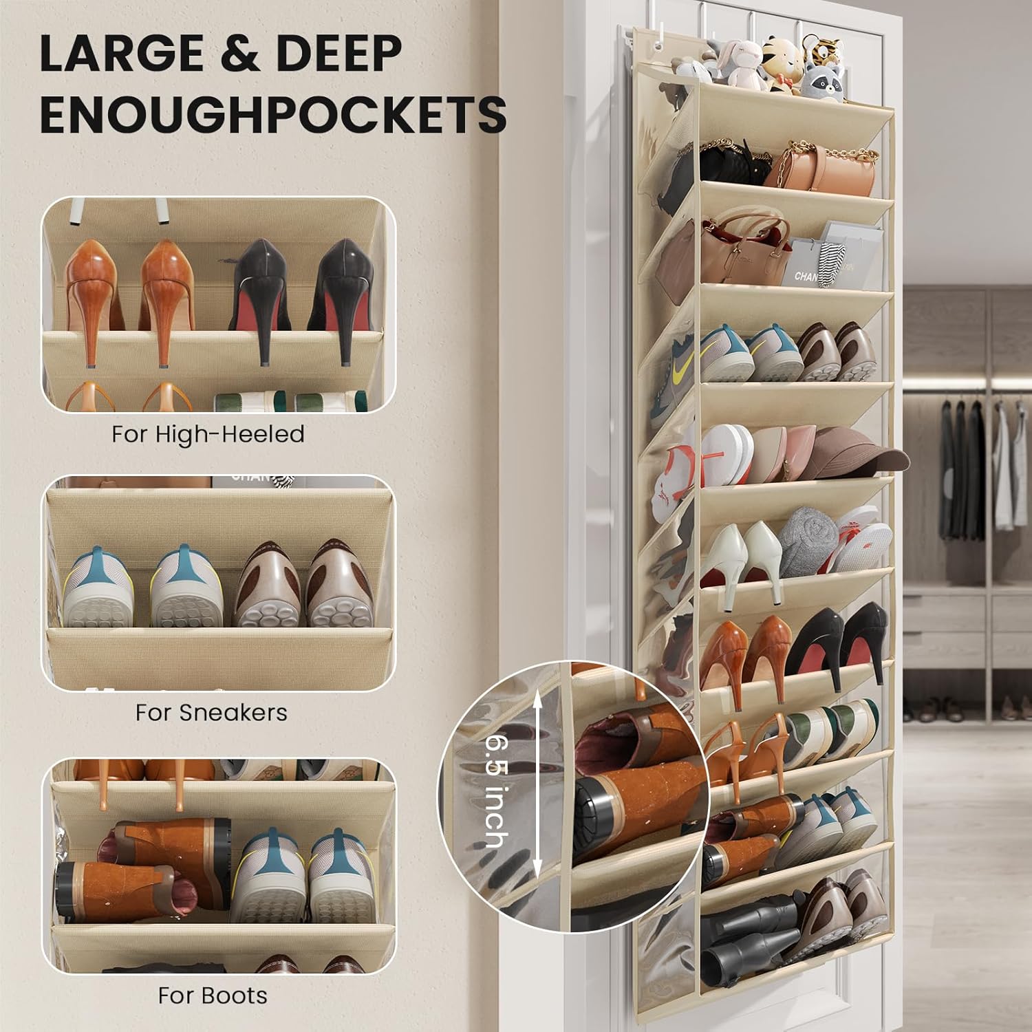 - 10 Tier Extra-Large & Deep Compartments: Our over-the-door shoe organizer features 10 Tier large and deep pockets, designed to hold 20-40 pairs of shoes. Effortlessly store 20 bulky size 12+ boots, heels, sandals, or flip-flops. Offers 40% more capacity than standard organizers