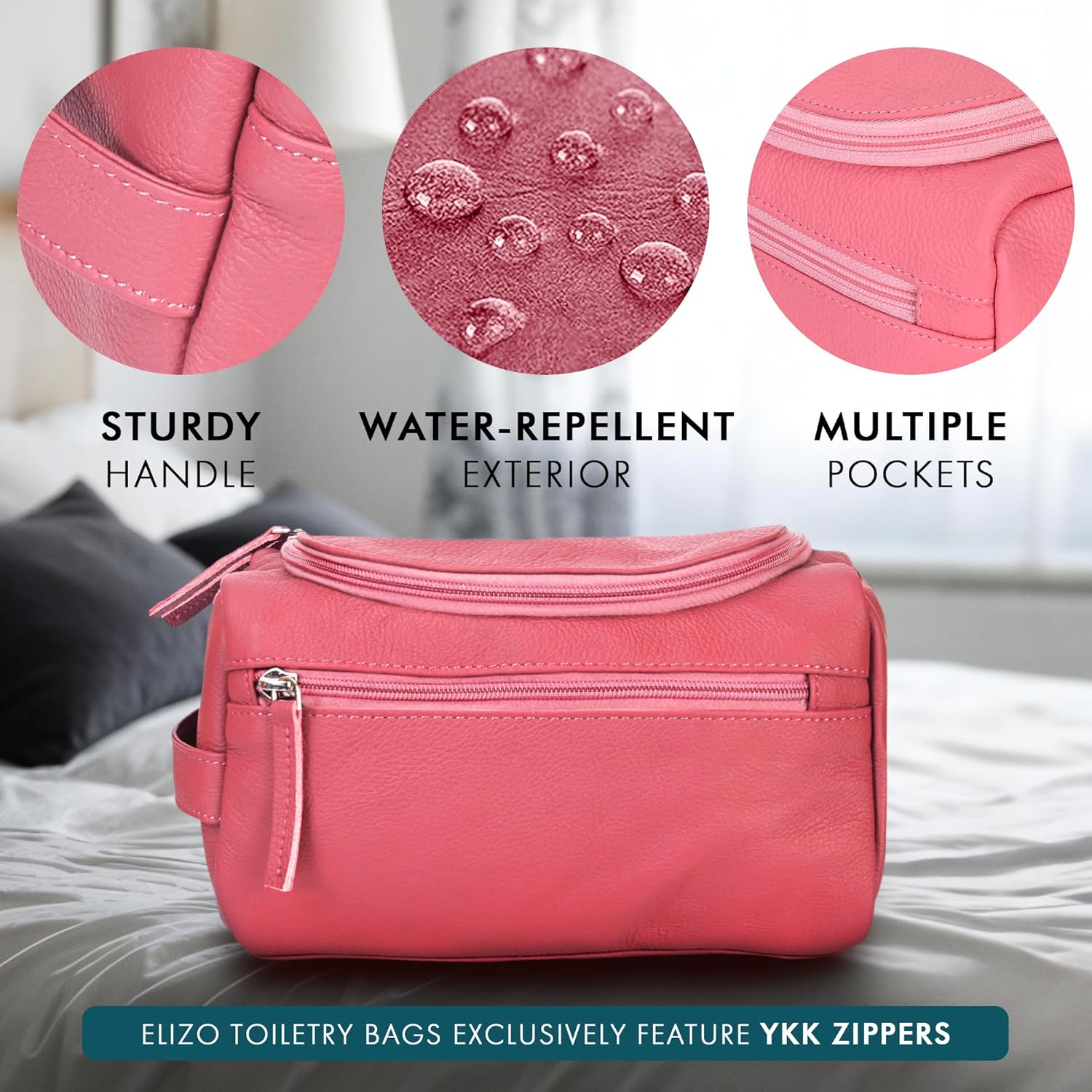 ELIZO Premium REAL Leather Toiletry Bag for Men Dopp Kitt Hanging Mens Toiletry Large TSA Toiletries Bag Shaving Grooming Bag Organizer Espresso (Pink, Large)