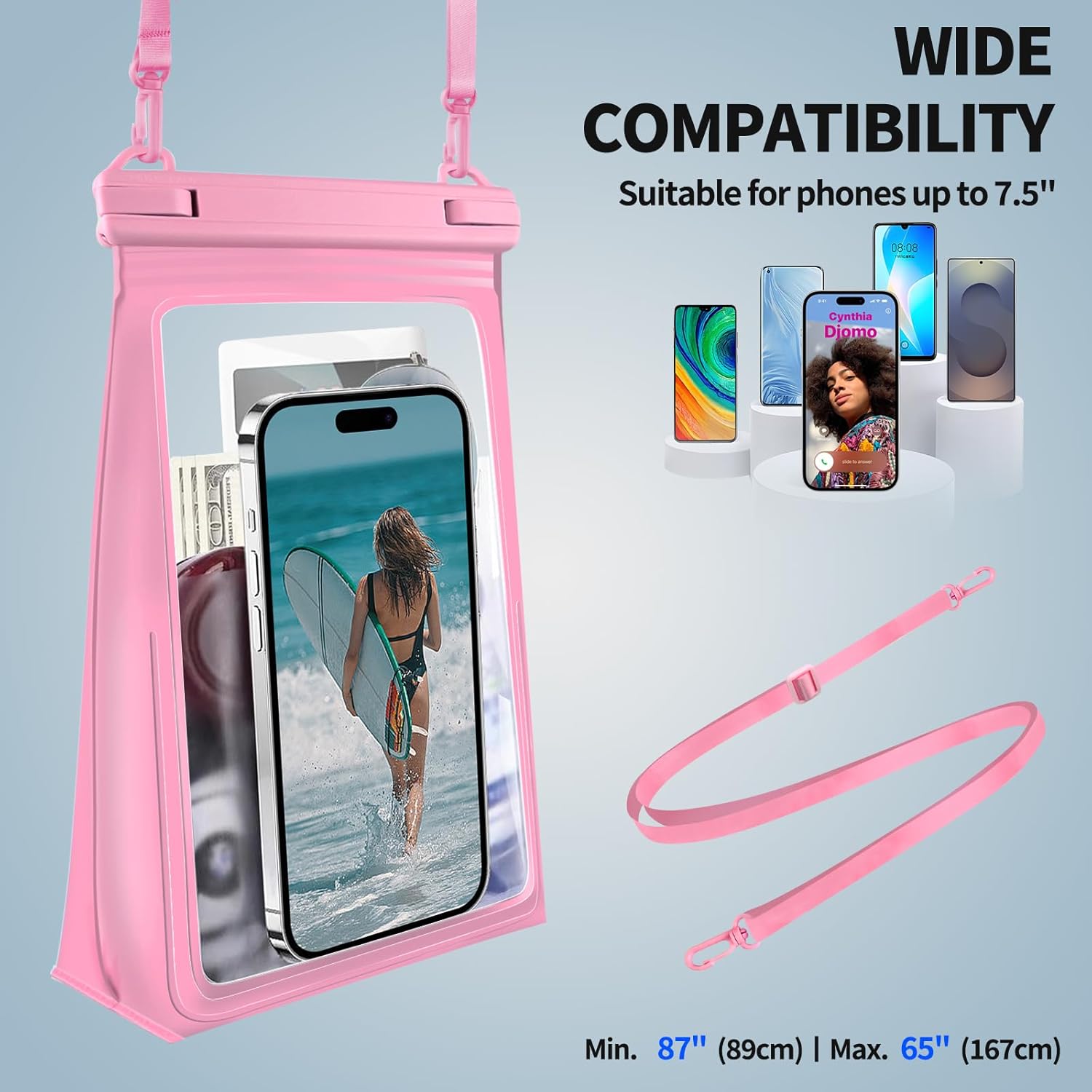 - LARGE CAPACITY SPACE & FIT MOREăThe large capacity waterproof phone pouch features a bottom triangle design to expand the space, 6" wider opening, makes it easier to put in/out. With 2 pockets, main pocket for all small items such as wallet, card, sunglasses, sunscreen, lipstick, keys, powers, headphones, small fan and other valuables; front pocket for all phone sizes such as iPhone 16 15 14 13 12 11 Pro Max Plus, Galaxy S25 S24 S23 S22 S21 Ultra Google Pixel, etc