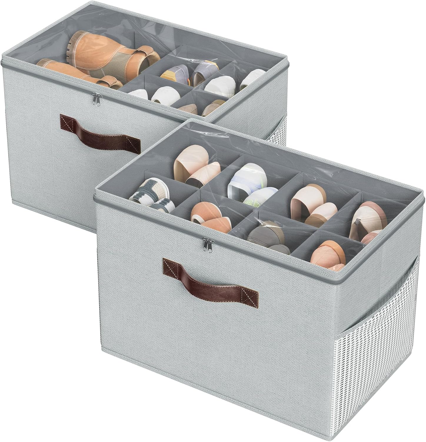 Budding Joy 2 Pack Shoe Organizer for Closet, Clear Foldable Shoe Storage Containers Adjustable Dividers Fits 16 Pairs,Shoe Storage Bins Baskets Boxes with Reinforced Handles Light grey