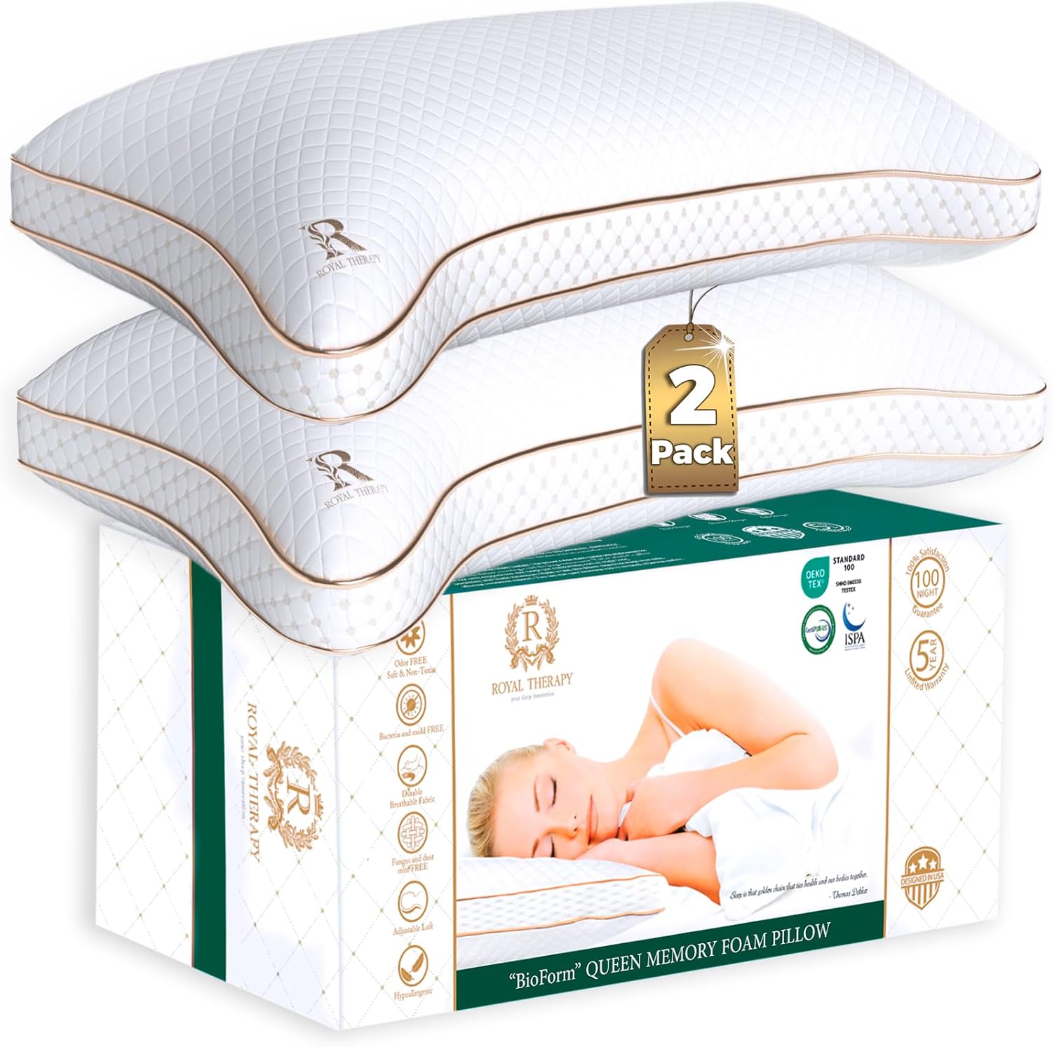 Royal Therapy Queen Memory Foam Pillows 2-Pack - Shredded Memory Foam Pillow for All Sleep Positions - Medium Firm Pillow with Adjustable, Bamboo Rayon Cover, CertiPUR-US, Oeko-TEX Certified