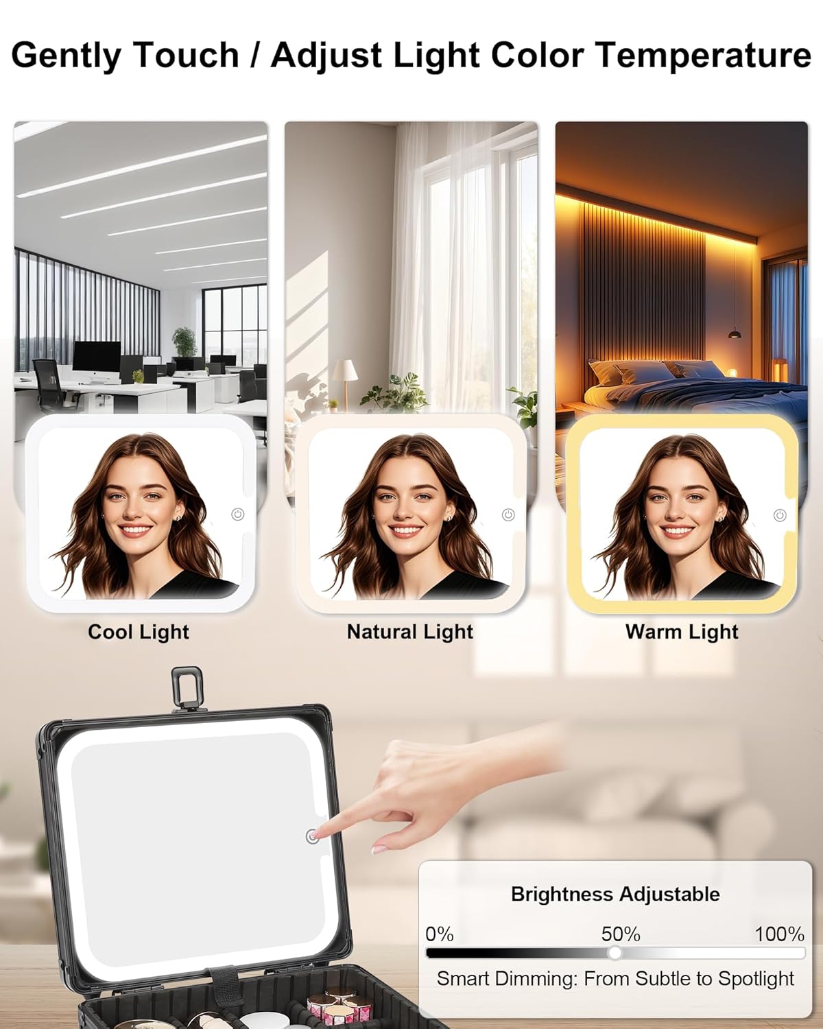 - 【Professional 3-Color Fill Light Mirror】Makeup bag with detachable velcro makeup mirror, and gently touching the switch can easily adjust color temperature between cold light, natural light, and warm light, revealing true skin & facial details, Long press to control the brightness from 0% to 100%. Widely use for sophisticated party, business attendance, or daily makeup.