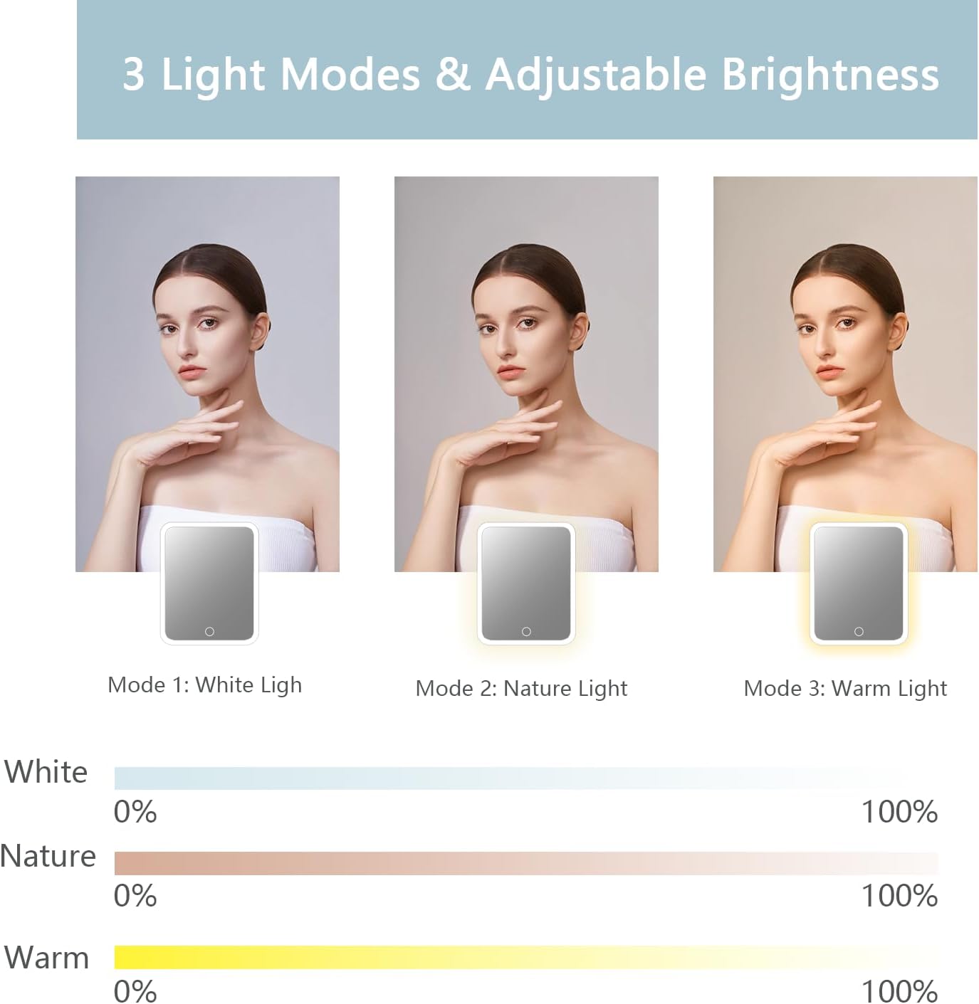 - 【makeup bag with led mirror】travel makeup bag is made of pu leather, waterproof and resistant, easy to clean.the travel makeup bag with of led light 3 color setting. 0-100% adjustable brightness that can be switched. with a long press on the switch, and a short press can adjust the color temperature between cool, natural and warm light.the make up bag can protect your cosmetics well, whether you are traveling or be away on official business, you can take your dresser everywhere.