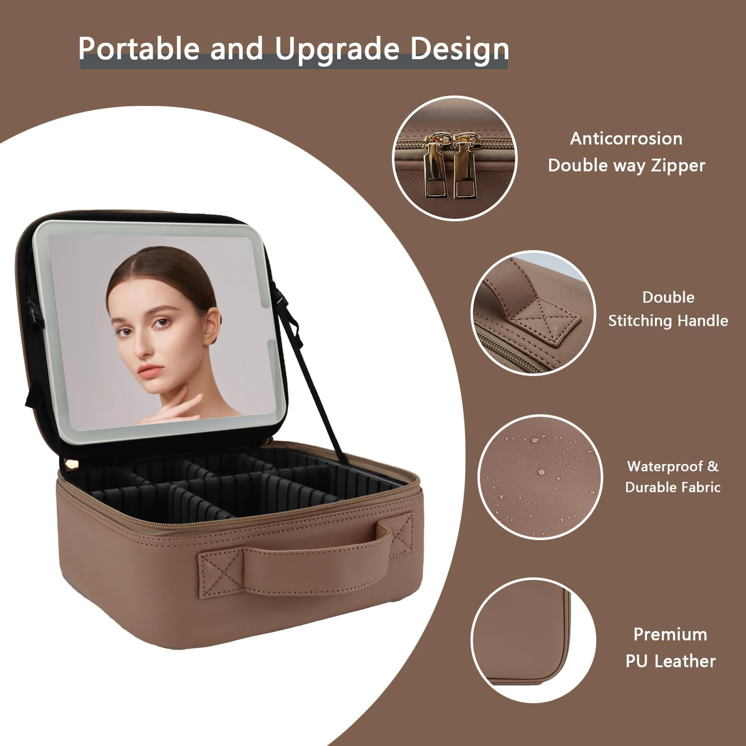 Makeup Bag with Led Mirror,Travel Makeup Organizer with 3 Color Setting, Portable Storage and Adjustable Dividers Travel Makeup Bag(Mocha)