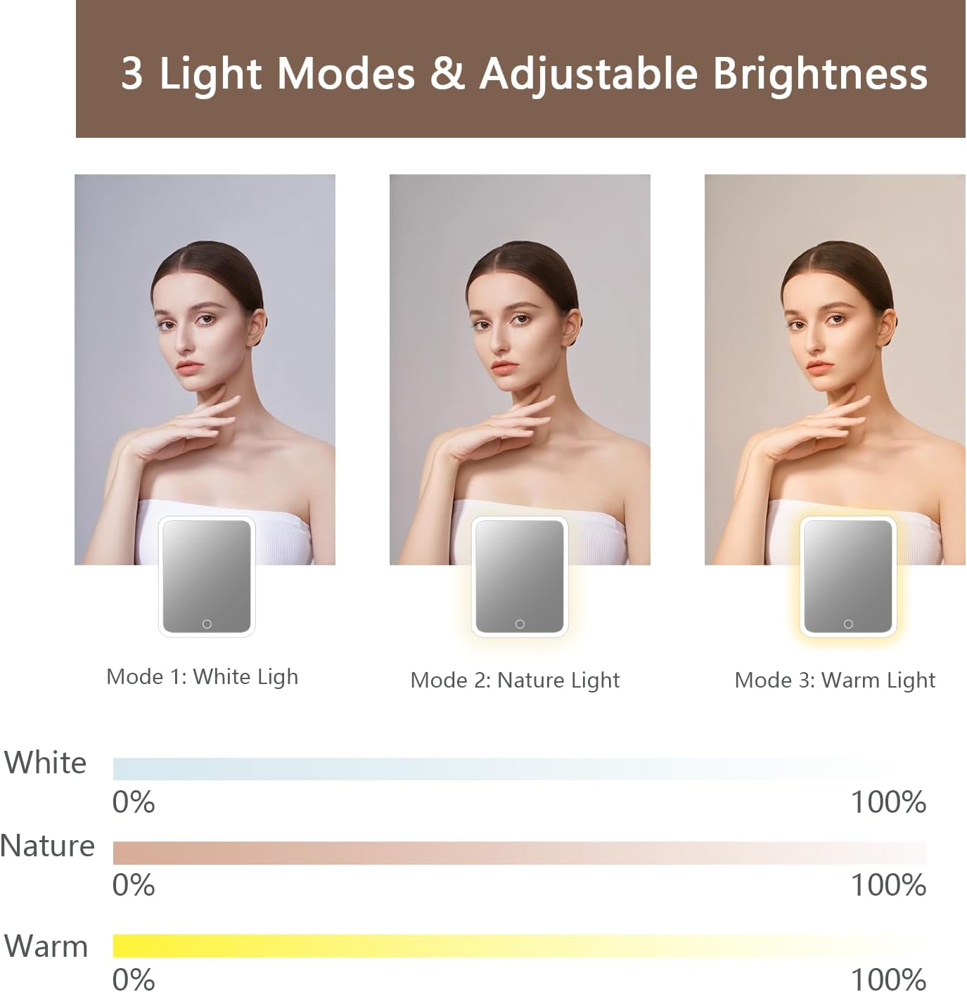 - 【makeup bag with led mirror】travel makeup bag is made of pu leather, waterproof and resistant, easy to clean.the travel makeup bag with of led light 3 color setting. 0-100% adjustable brightness that can be switched. with a long press on the switch, and a short press can adjust the color temperature between cool, natural and warm light.the make up bag can protect your cosmetics well, whether you are traveling or be away on official business, you can take your dresser everywhere.