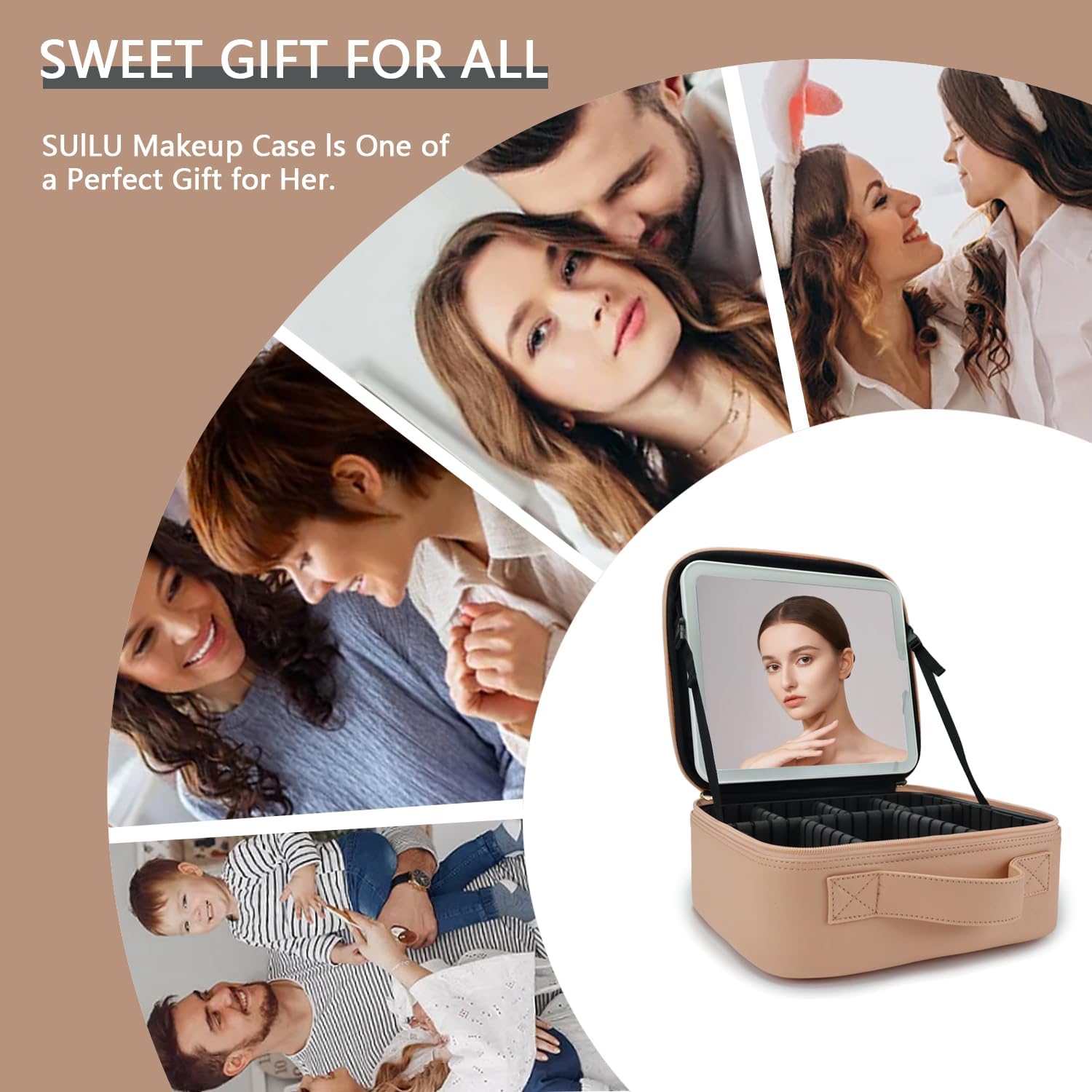 - 【ideal perfect gift】SUILU makeup bag with led mirror is the perfect gift for your wife, girl friend, mother, makeup lovers in any special days, such as mother's day, birthdays, valentine's day, halloween, anniversaries, christmas and more.it is not only storage your cosmetics, but also jewelry, electronic accessories, camera, essential oil, toiletries, shaving kit, valuable objects and so on.a must-have for your travels.