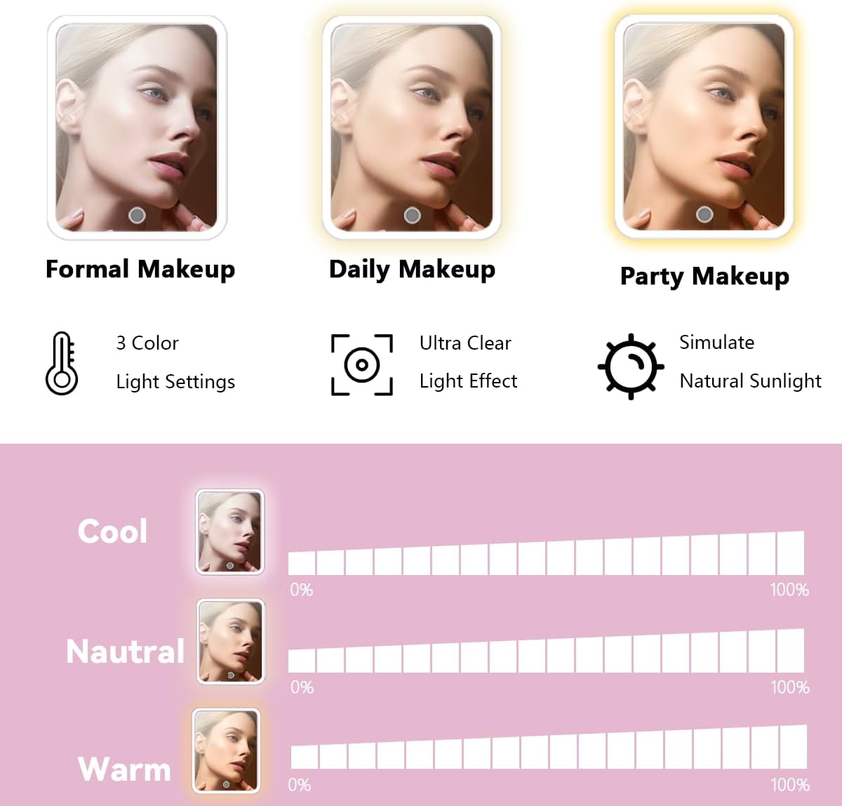 - 【Removable & Adjustable brightness High Definition LED mirror】:3 lighting modes and 0-100% adjustable brightness that can be switched. With a long press on the switch, and a short press can adjust the color temperature between cool, natural and warm light.The makeup mirror is firmly attached to the makeup bag by Velcro and can be disassembled for separate use, and the makeup mirror comes with a separate stand that can be conveniently placed on the table according to your needs.