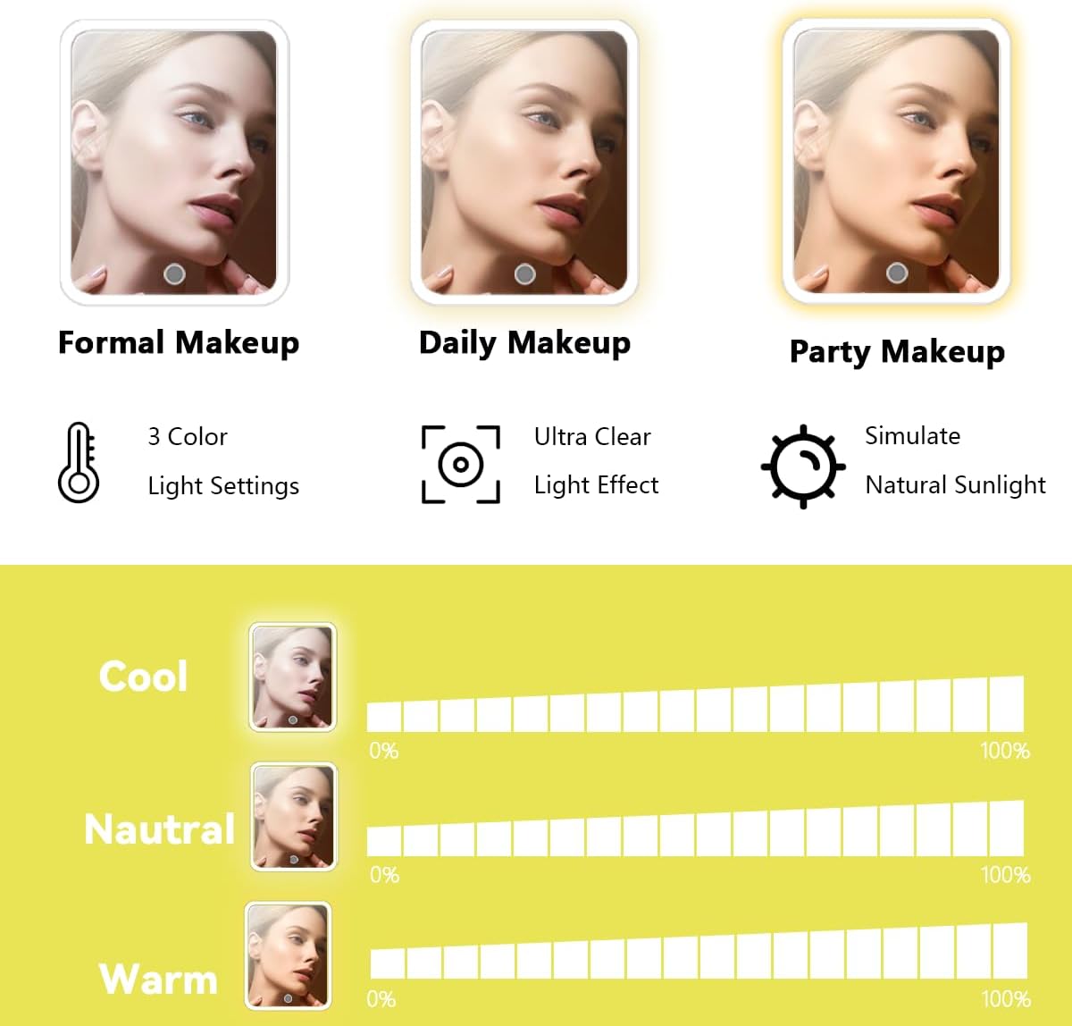 - 【Removable & Adjustable brightness High Definition LED mirror】:3 lighting modes and 0-100% adjustable brightness that can be switched. With a long press on the switch, and a short press can adjust the color temperature between cool, natural and warm light.The makeup mirror is firmly attached to the makeup bag by Velcro and can be disassembled for separate use, and the makeup mirror comes with a separate stand that can be conveniently placed on the table according to your needs.