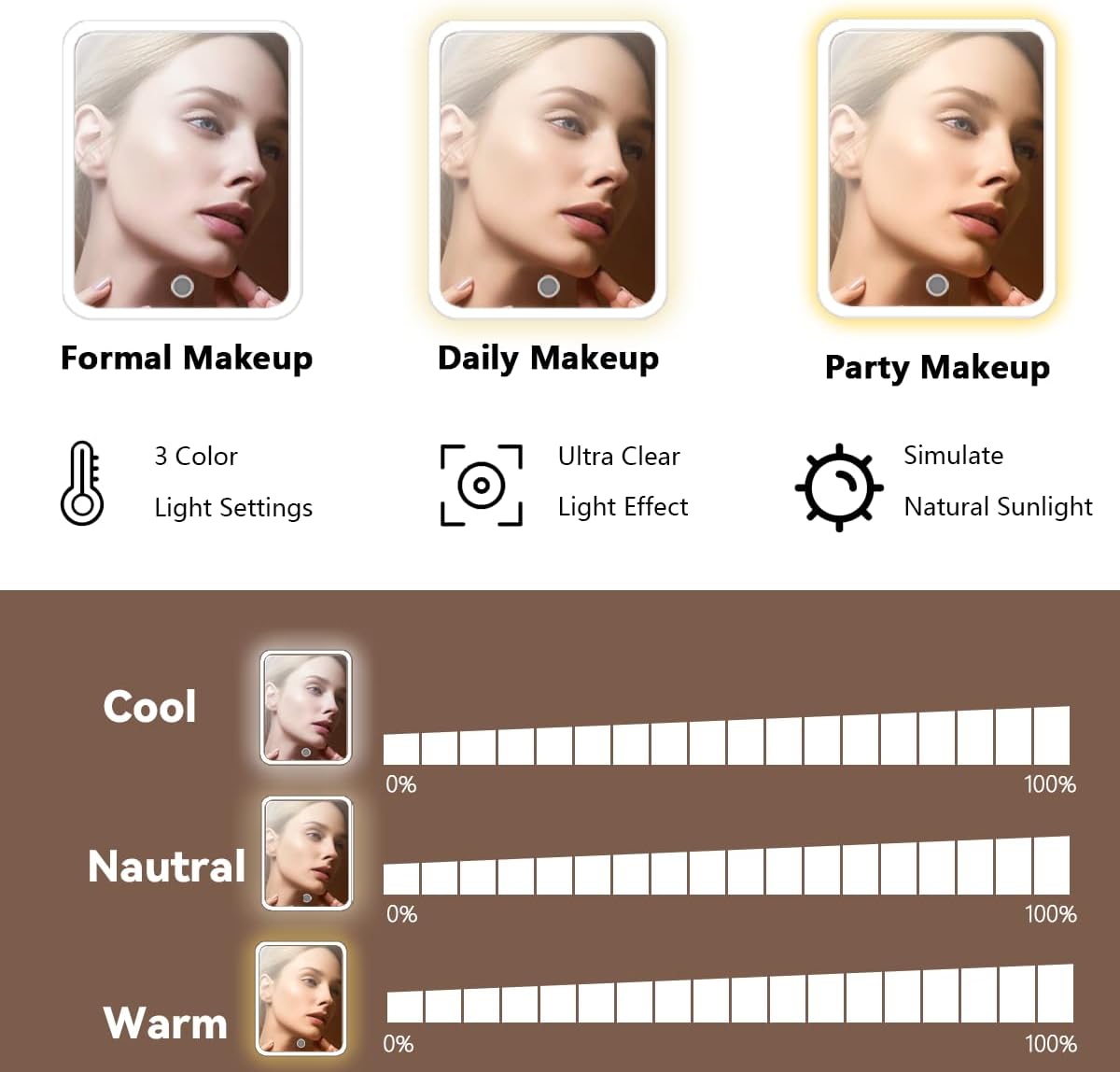 - 【Removable & Adjustable brightness High Definition LED mirror】:3 lighting modes and 0-100% adjustable brightness that can be switched. With a long press on the switch, and a short press can adjust the color temperature between cool, natural and warm light.The makeup mirror is firmly attached to the makeup bag by Velcro and can be disassembled for separate use, and the makeup mirror comes with a separate stand that can be conveniently placed on the table according to your needs.