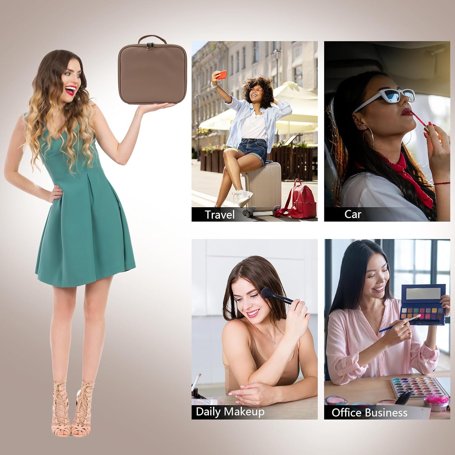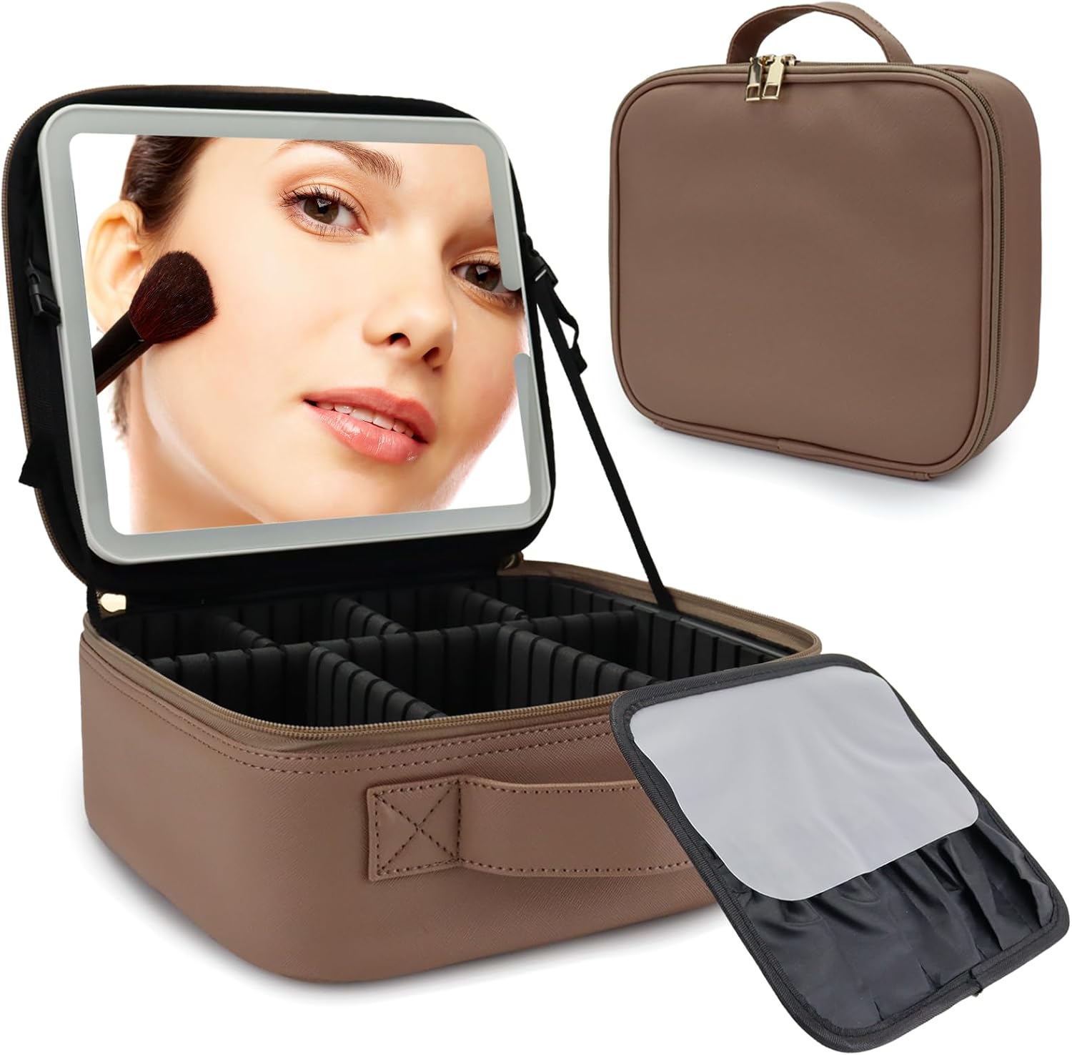 Travel Makeup Bag with LED Mirror Travel Makeup Organizer with 3 Lighted Settings, Adjustable Dividers and Makeup Brush Storage Bag Mocha