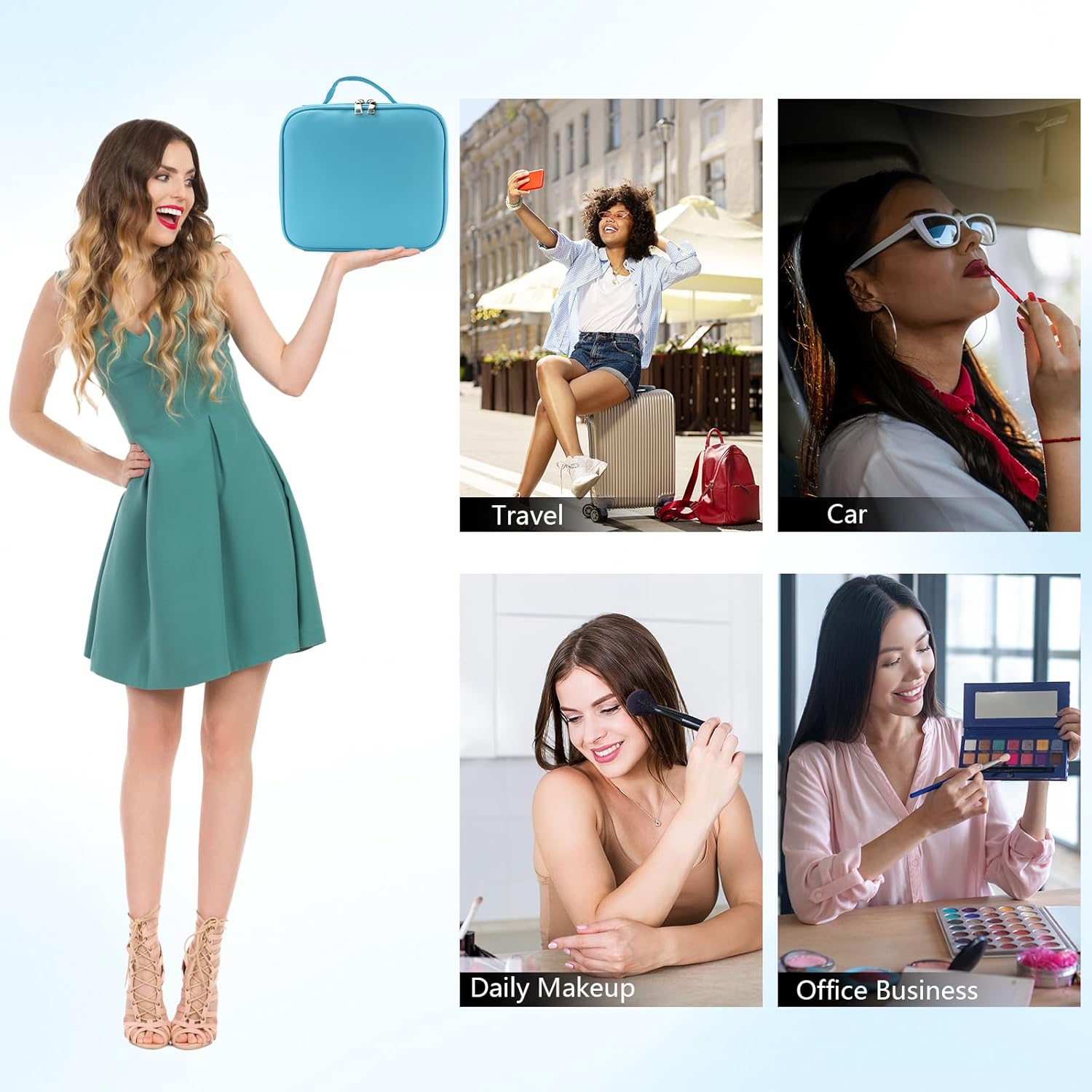 - 【Three-Color Light Source】The travel makeup organizer comes with a 9.05*7.87 inch makeup mirror. Makeup LED mirror has 3 lighting modes, short press can switch between white light, warm light, natural light, simulate the makeup under different lighting environment, show the real skin and face details. Long press to adjust the brightness of the LED fill light (0-100%).