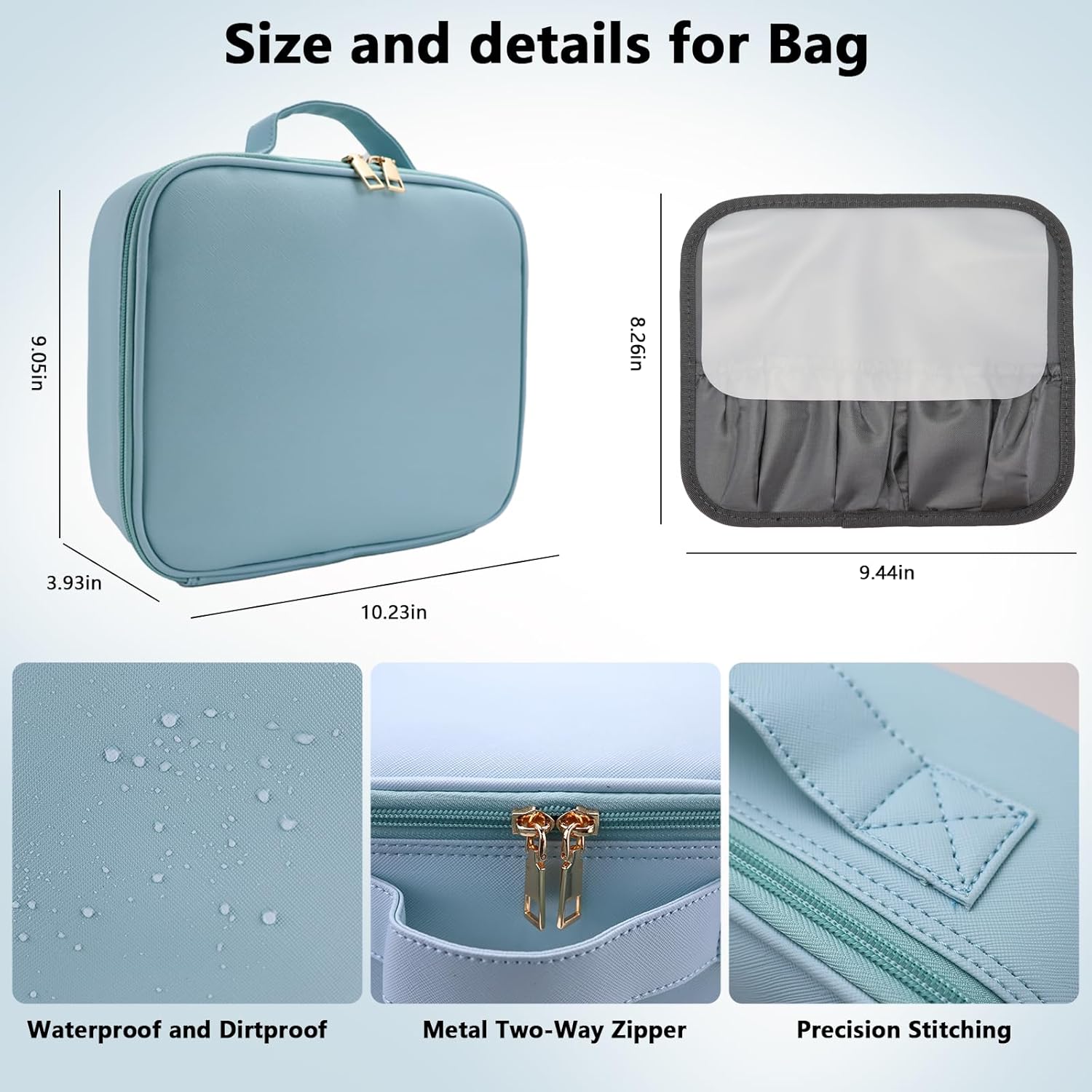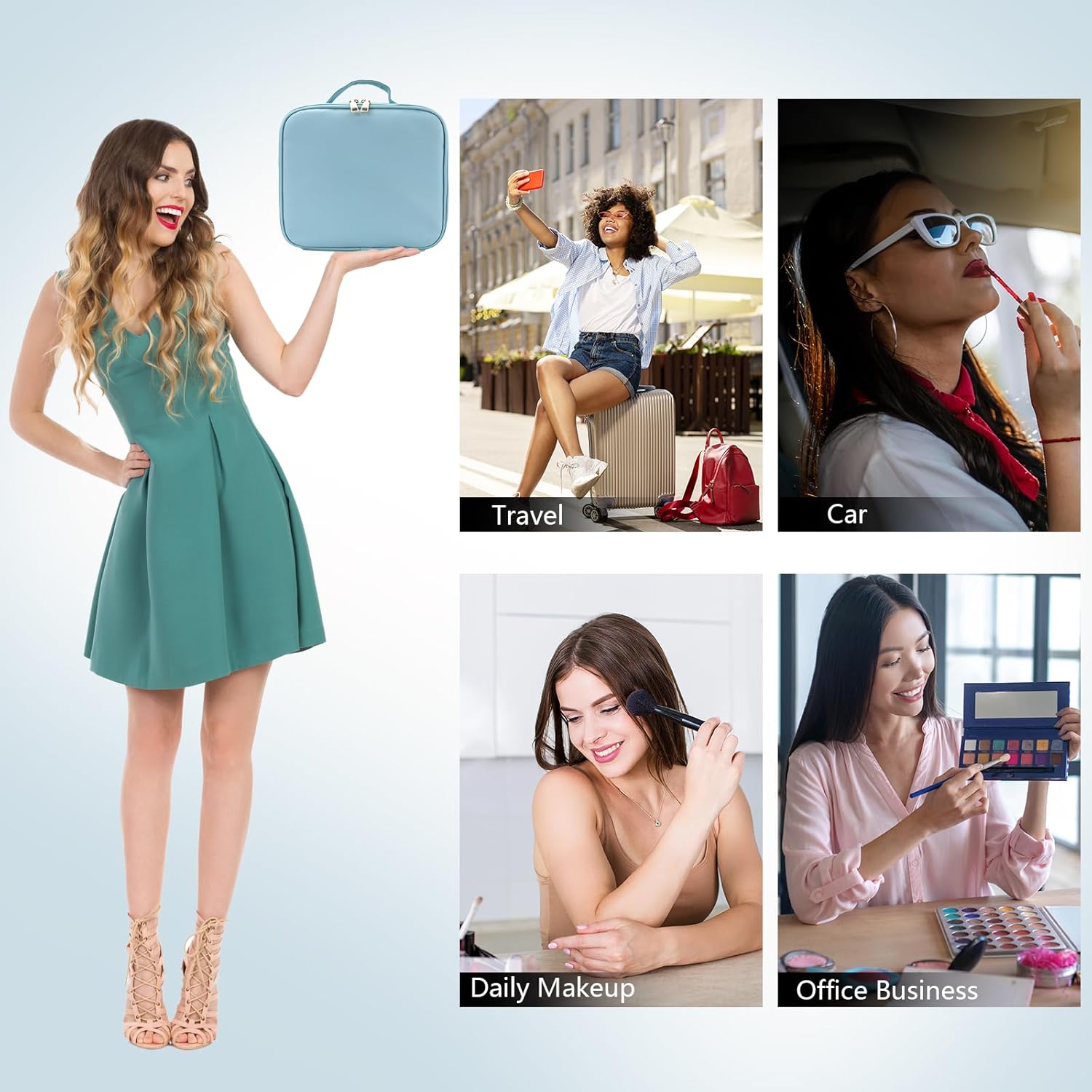 Travel Makeup Bag with LED Mirror Travel Makeup Organizer with 3 Lighted Settings, Adjustable Dividers and Makeup Brush Storage Bag Light Blue