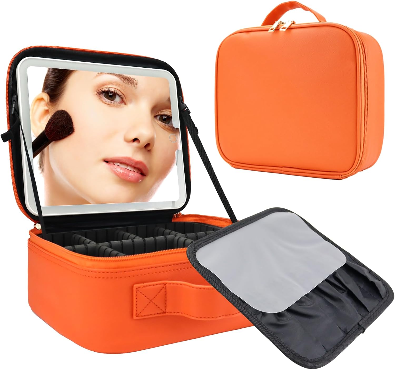 Travel Makeup Bag with LED Mirror Travel Makeup Organizer with 3 Lighted Settings, Adjustable Dividers and Makeup Brush Storage Bag Orange