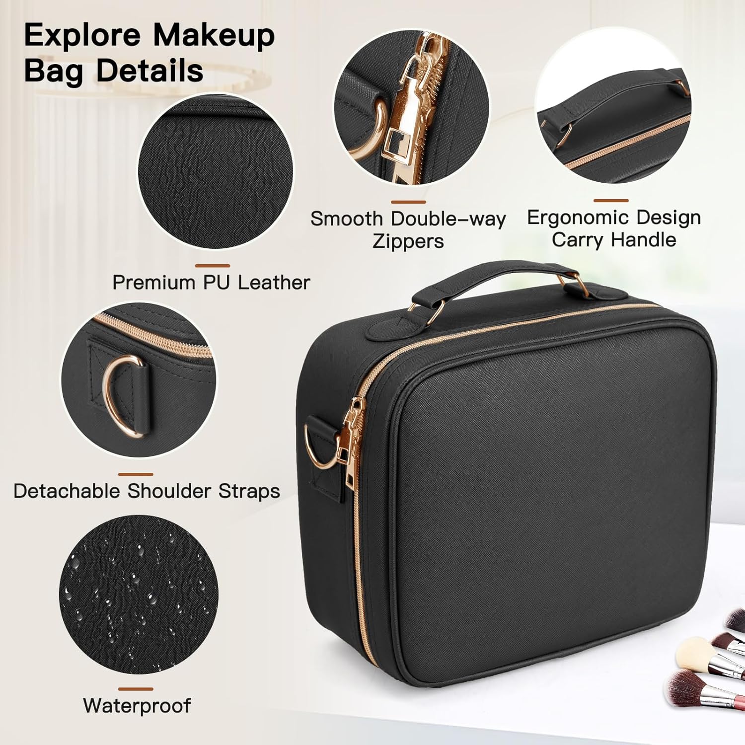 - 【Organize Cosmetics】This makeup organizer has 6 removable shockproof EVA dividers, 10 cosmetic brush slots can safely store makeup brushes of different sizes, effectively maintaining the shape and cleanliness of the bristles; Designed with an ergonomic handle and an adjustable shoulder strap for cross body wear, this bag also has an elastic luggage pull rod fixing strap, facilitating hands free travel, it can be a travel essential for women