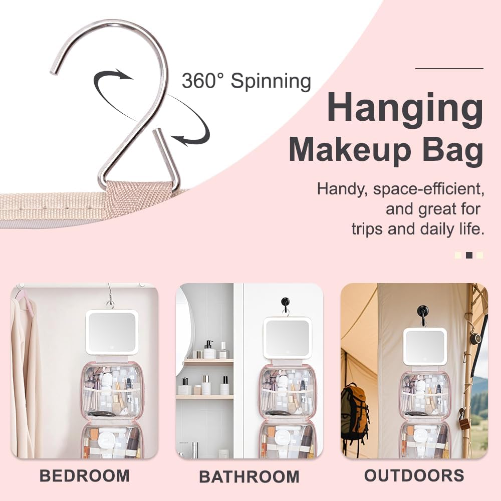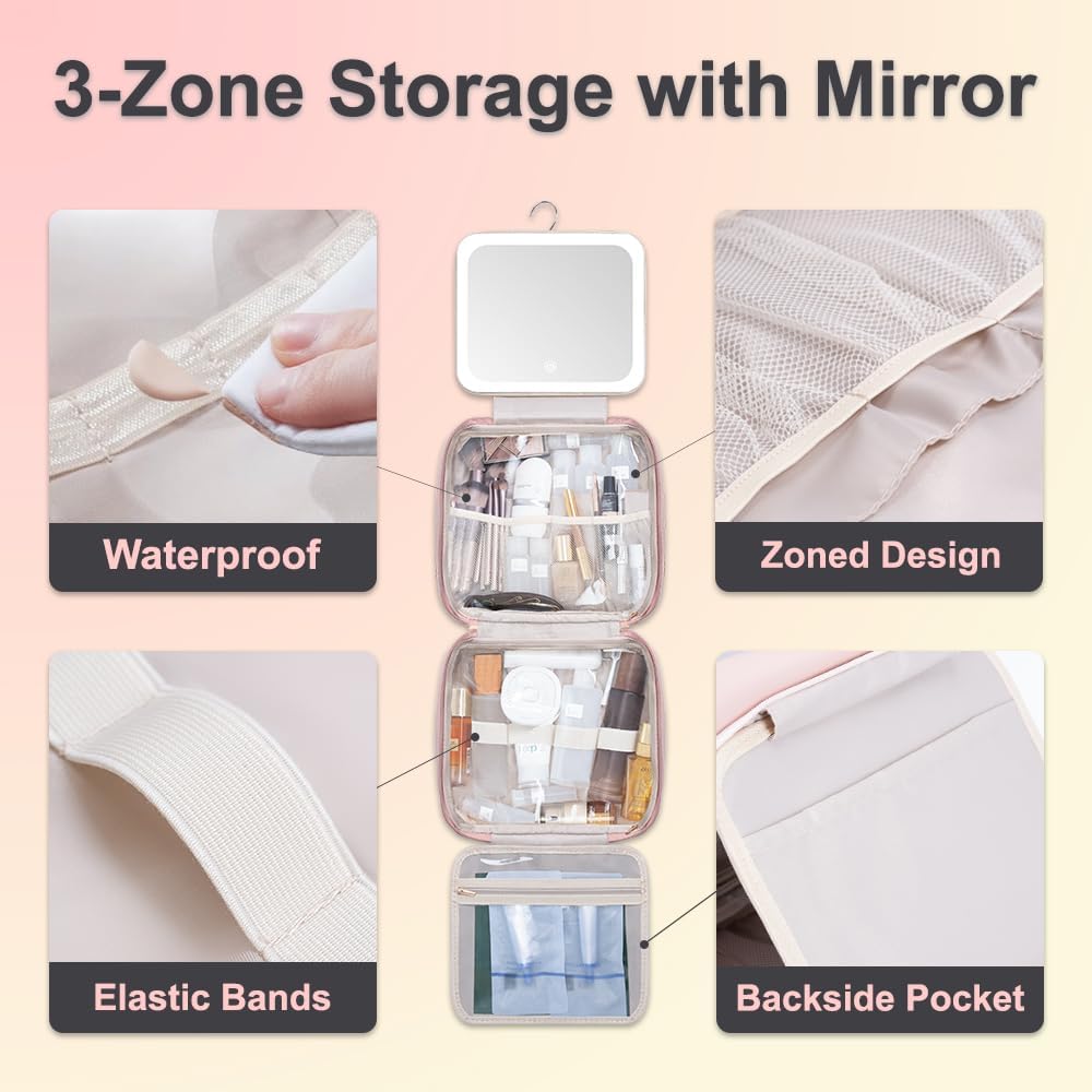 Glint&Glide Travel Makeup Bag with LED Lighted Detachable Mirror, Tri-light Dimmable - Hanging Multi-Compartment Organizer for Women, Portable Cosmetic Case with Four Divided Storage, Pink