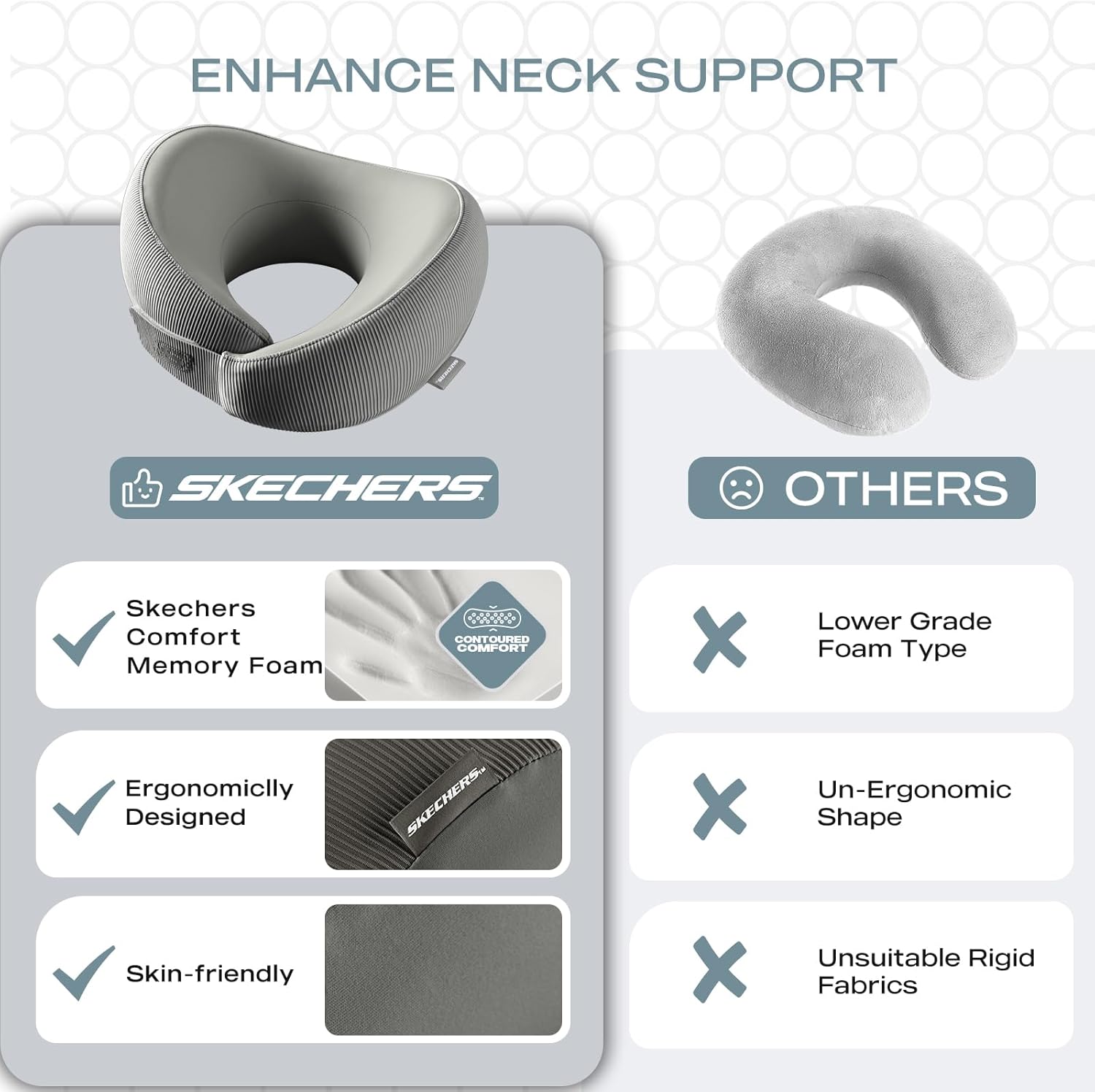 - SKECHERS COMFORT & SUPPORT-Skechers Memory Foam Neck Pillow is designed with the same commitment to comfort and support that defines the Skechers brand. This neck pillow combines premium materials and ergonomic design to provide ultimate comfort and relief for your neck.