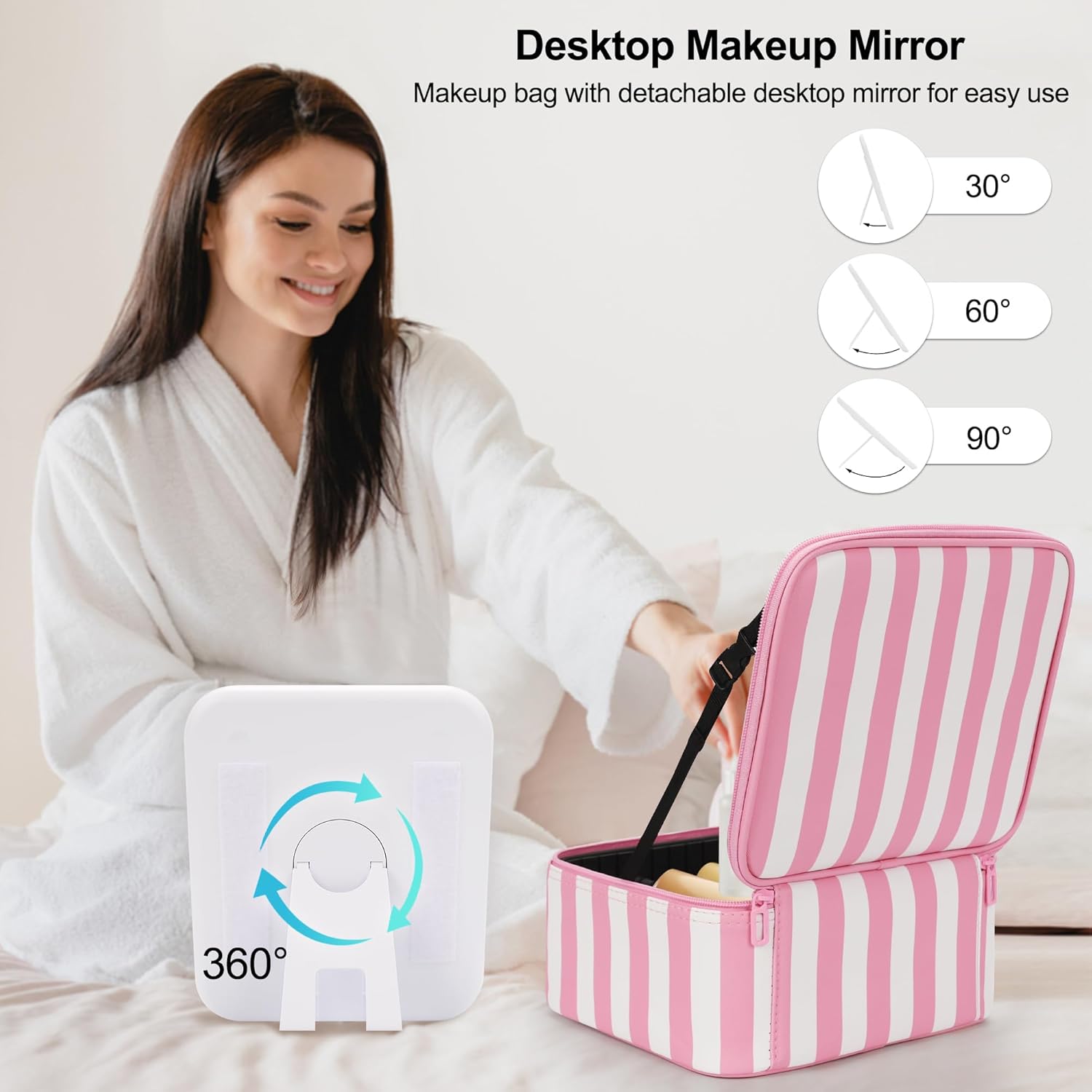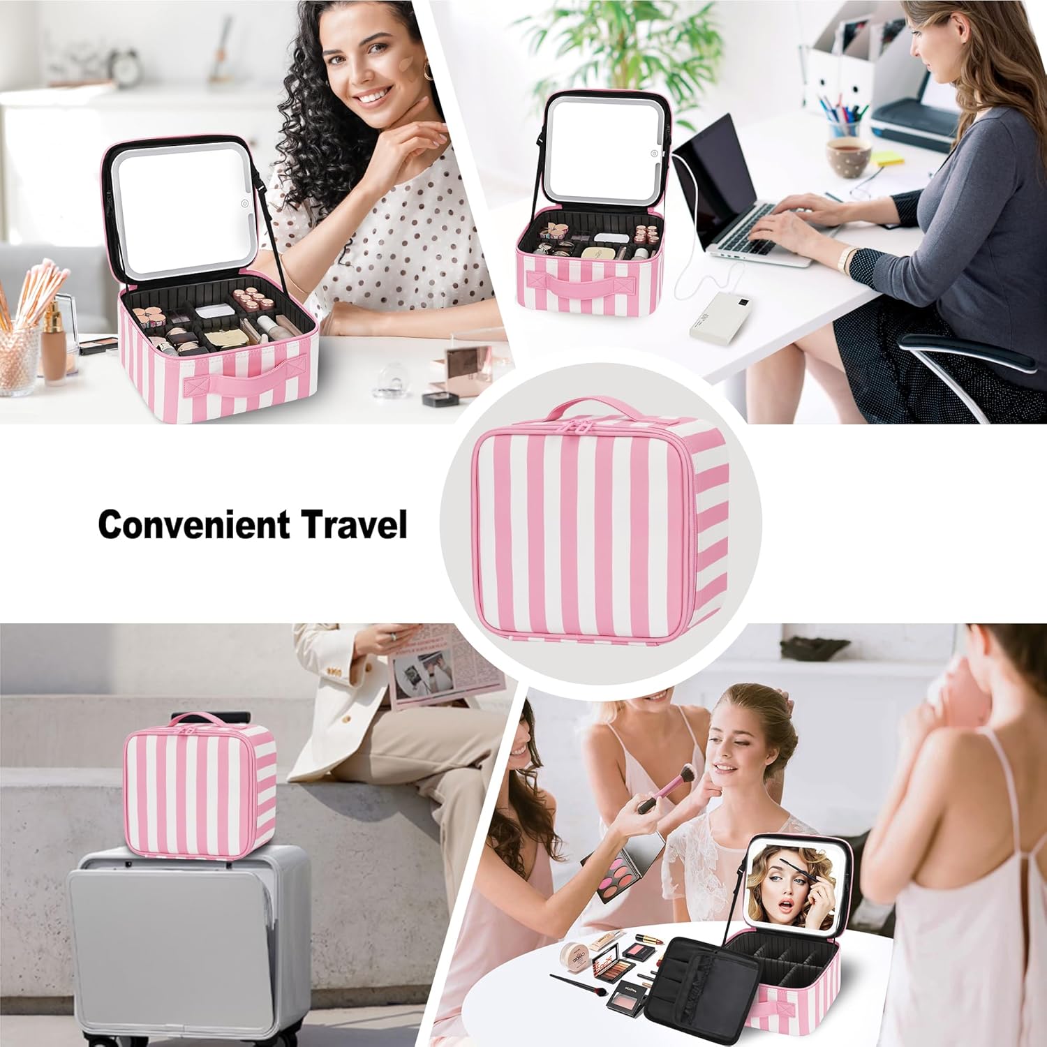 Makeup Bag With LED Mirror, Travel Makeup Case with Light up Mirror Large Cosmetic Case with 3 Color Lighted Portable Organizer Bag with Adjustable Dividers (Pink/White Stripes, Small)