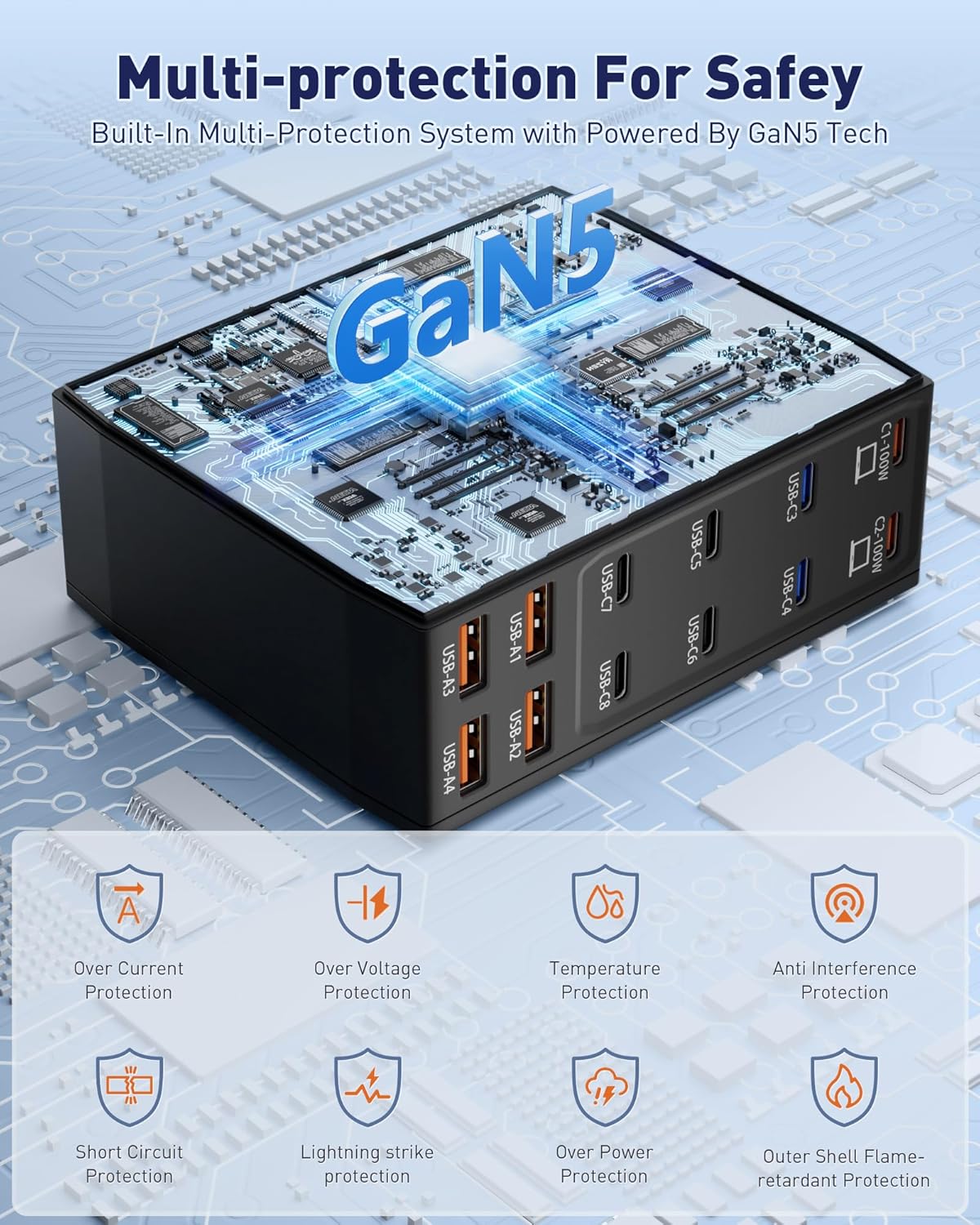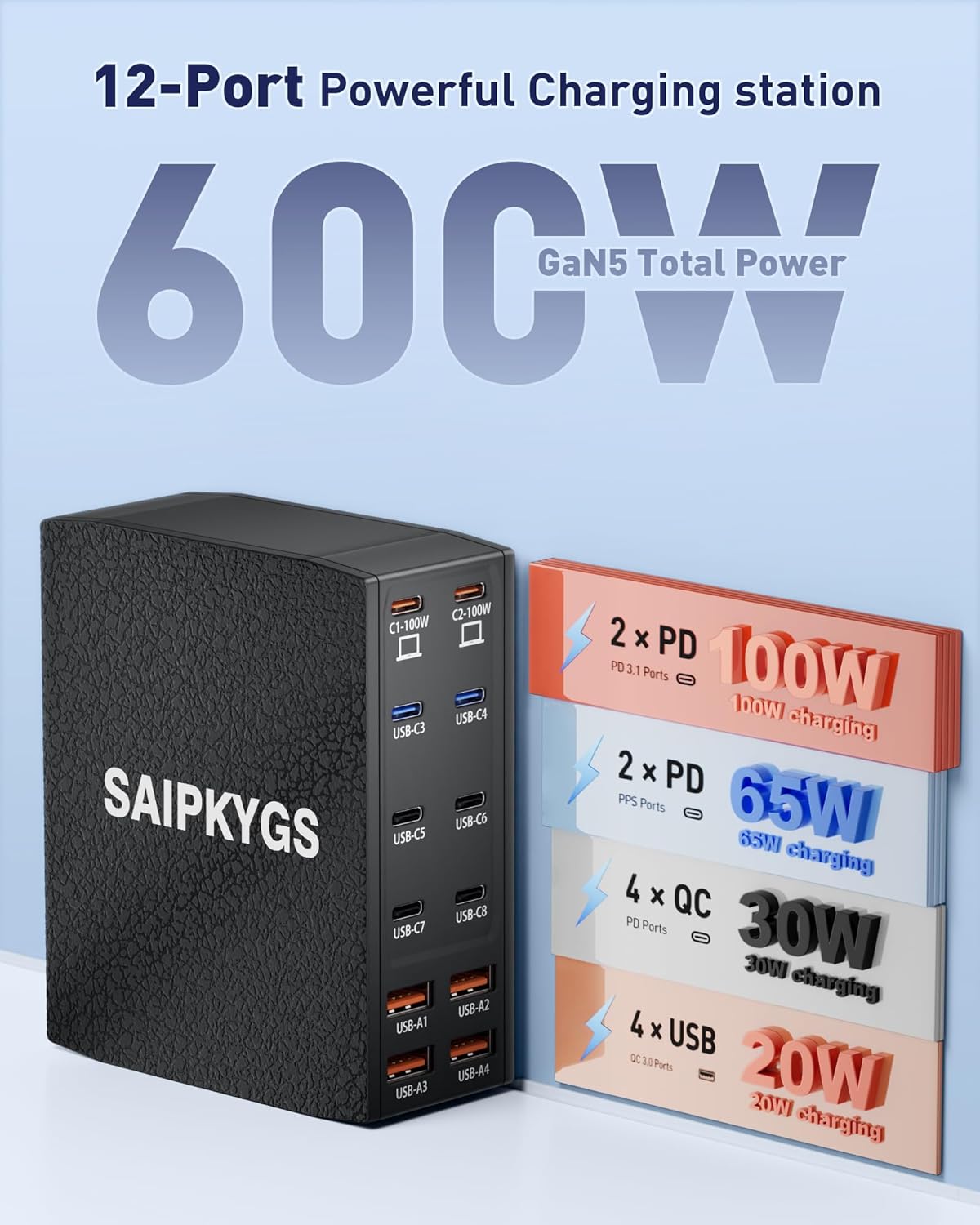 - ă12-in-1 USB C Charging StationăThis 600W USB C Charger Block comes with 8 USB C ports and 4 USB A ports to charge multiple devices, simplify your charging setup, and let you experience the convenience of ultra-fast and ultra-high output charging. With its smart charging technology, it can automatically detect and provide the best power output for each connected device, ensuring fast and efficient charging.