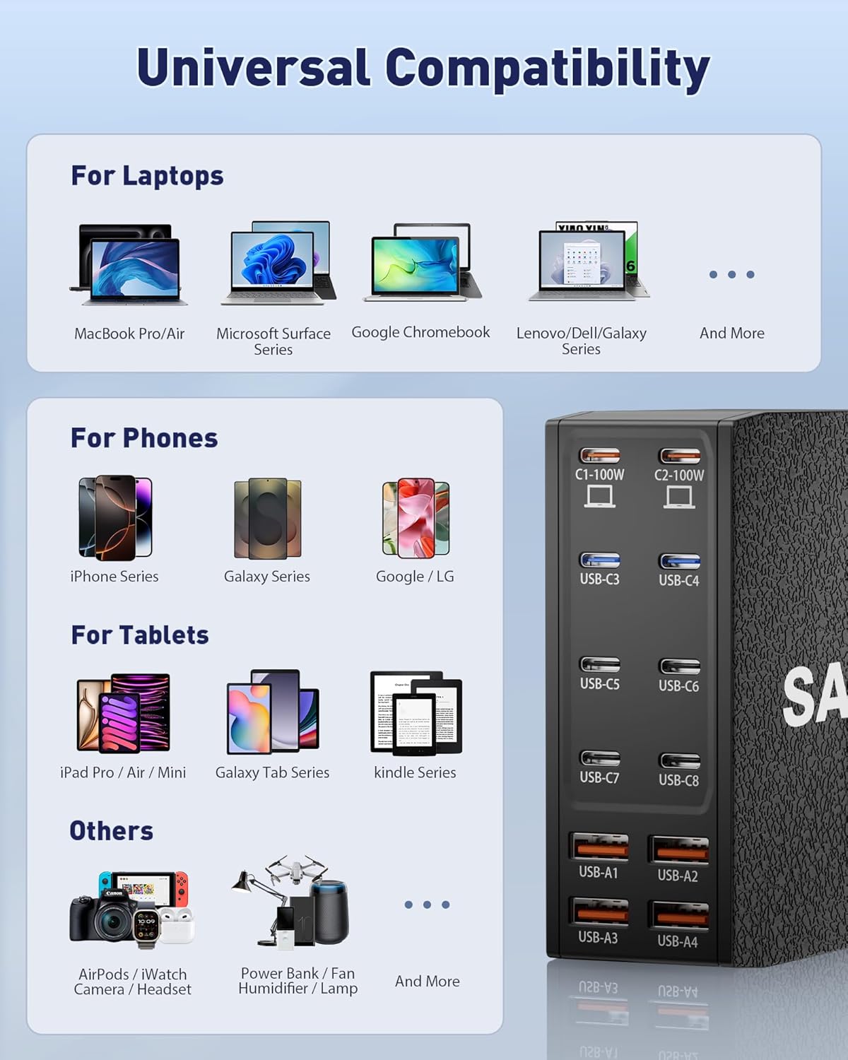 - ăUniversal CompatibilityăOur USB C charging station is equipped with 2*100W and 2*65W fast charging ports, which can charge 3 or more laptops at the same time. Compatible with smartphones, tablets and laptops, suitable for MacBook Pro/Air, Dell XPS, iPad Pro, Phone 16/16 Pro Max, Phone 15 Pro Max, Phone 14/13 Pro/12 Pro Max, iWatch, AirPods, Surface Pro, Galaxy S24 Ultra, Switch, Steam Deck, Google Pixel and many other devices.