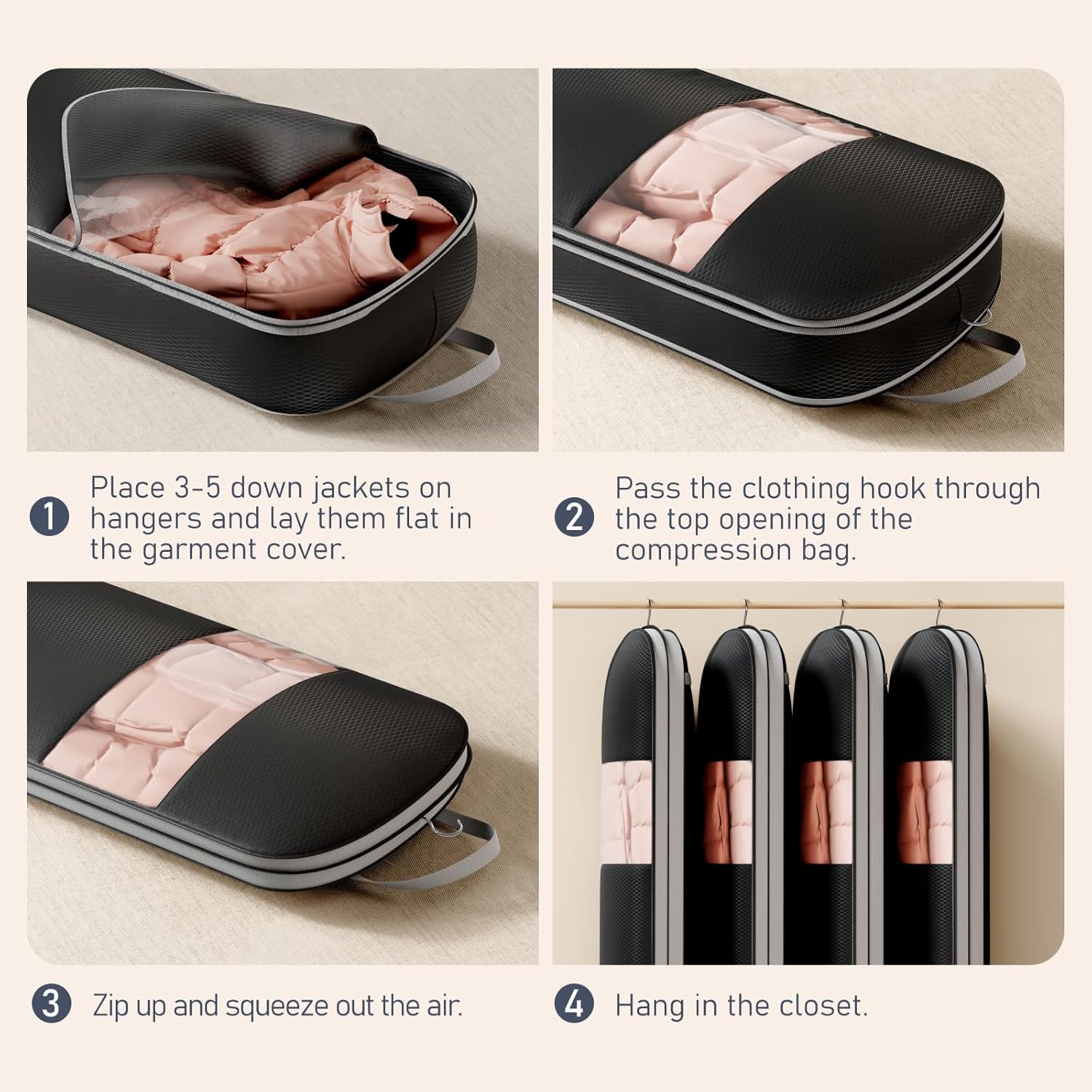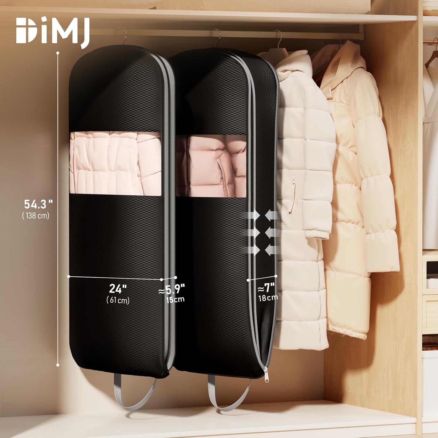 - Upgraded Compression Bag: Our DIMJ hanging garment bag features an innovative self-compression design—no vacuum pump required; simply place your clothes in the bag and zip it up to instantly reduce bulk. This protects the fibers and down in suits, jackets, coats, and down jackets from damage, saving space while ensuring your items retain their fluffy softness when reused