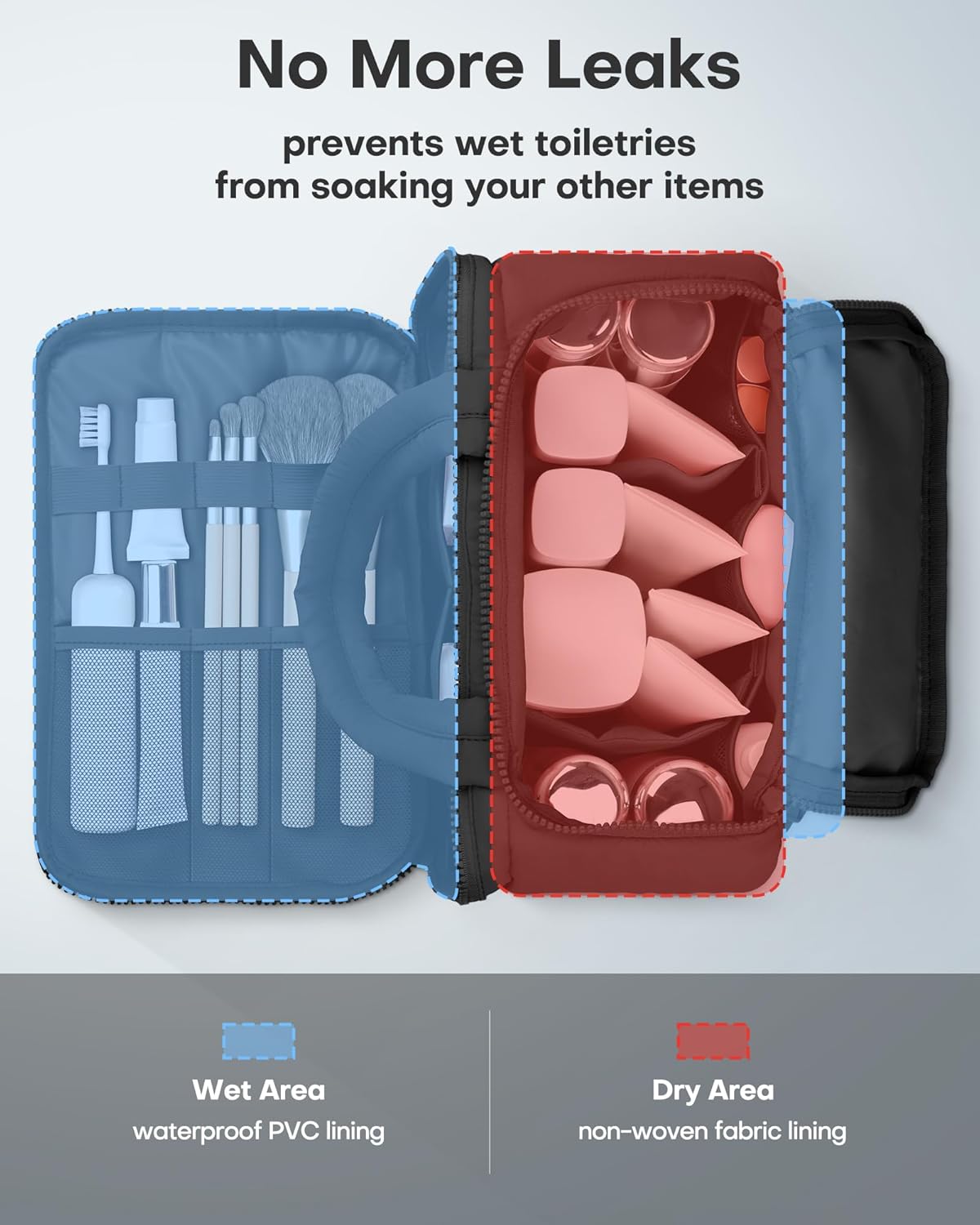 - WET & DRY SEPARATION: The front and rear compartments of this travel toiletry bag for women are lined with waterproof PVC, effectively separating damp items from dry ones. Say goodbye to wet towels or soaked brushes messing up your clean items. Help your toiletries stay organized and your suitcase stay fresh with HOTOR.