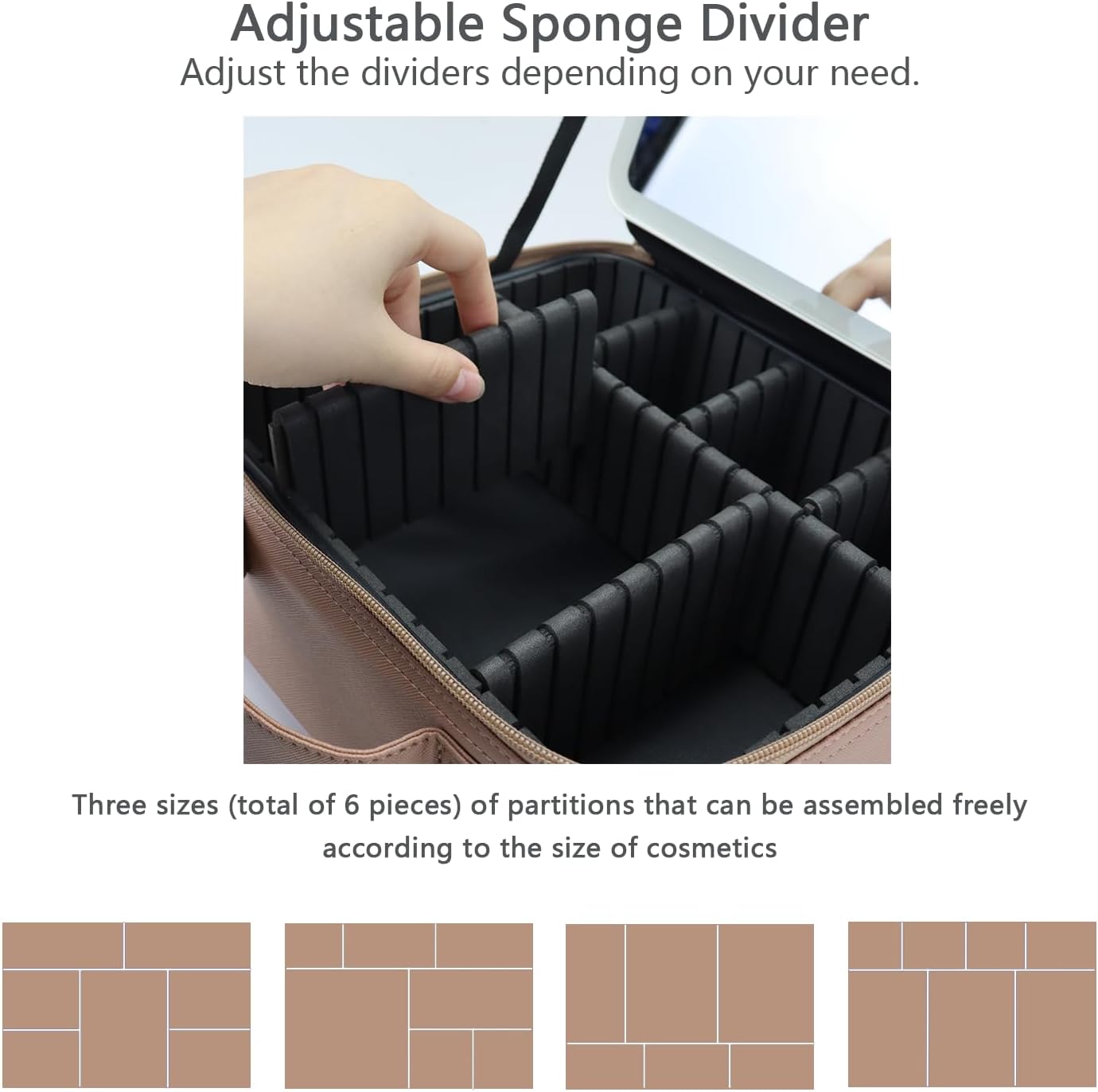 Makeup Bag with Led Mirror,Travel Makeup Organizer with 3 Color Setting & 10X Magnifying Mirror, Portable Storage and Adjustable Dividers Travel Makeup Bag-khaki