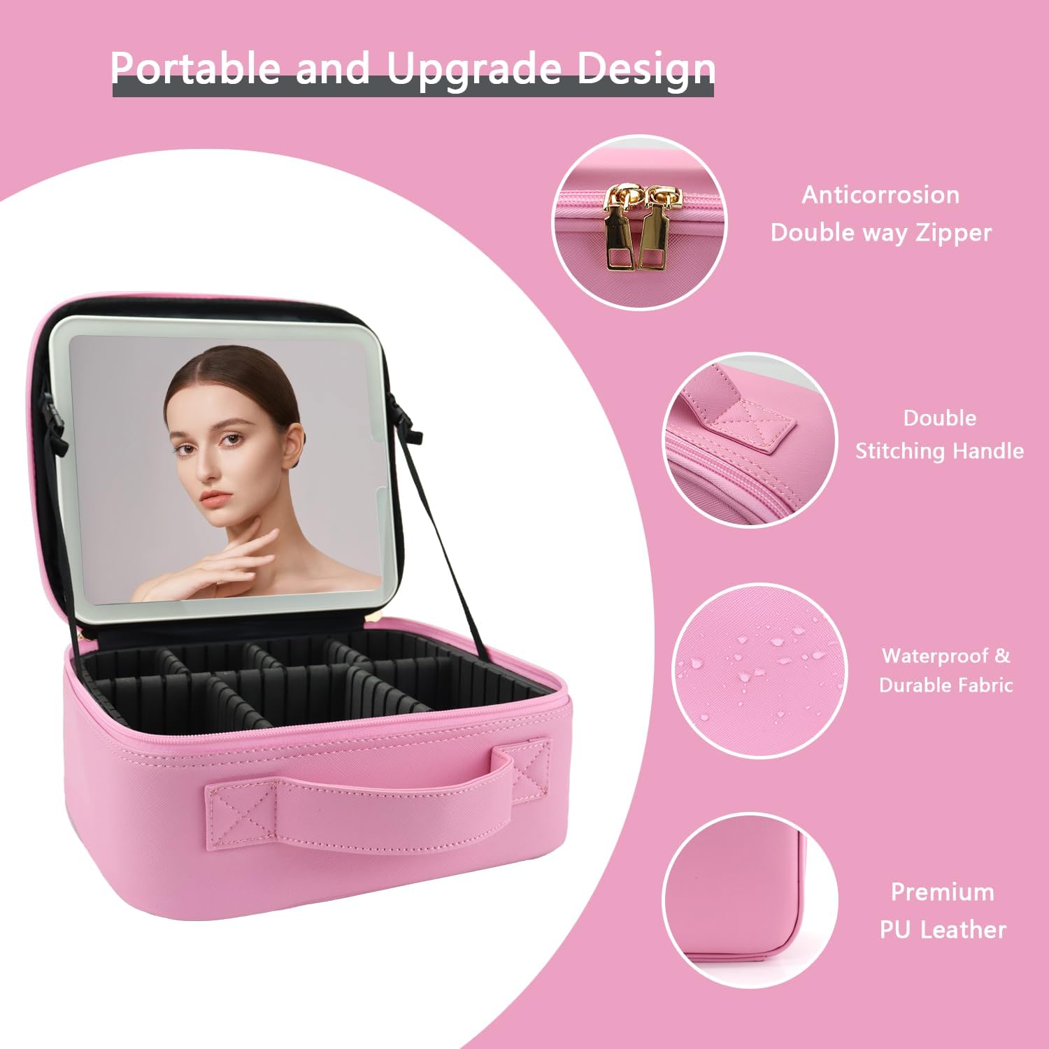 Makeup Bag with Led Mirror,Travel Makeup Organizer with 3 Color Setting & 10X Magnifying Mirror, Portable Storage and Adjustable Dividers Travel Makeup Bag-Dark Pink