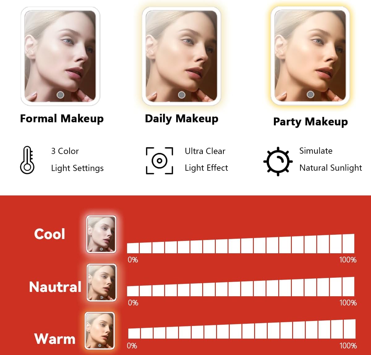 - Removable & Adjustable Brightness High Definition LED mirror:the travel makeup bag with vanity mirror of led light 3 color setting and 10x Magnifying Mirror. and 0-100% adjustable brightness that can be switched. With a long press on the switch, and a short press can adjust the color temperature between cool, natural and warm light.can be disassembled for separate use, and the makeup mirror comes with a separate stand that can be conveniently placed on the table according to your needs.