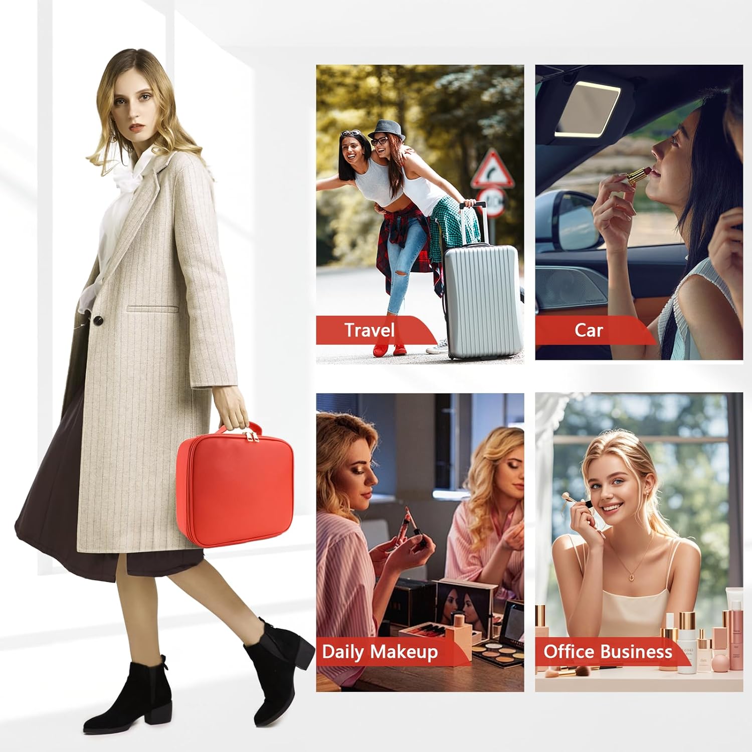 Travel Makeup Bag for Makeup Artists Large Makeup Case,with Mirror 3 Color Setting and Detachable 10x Magnifying Mirror Travel Makeup Bag,Portable Storage and Adjustable Dividers(red)