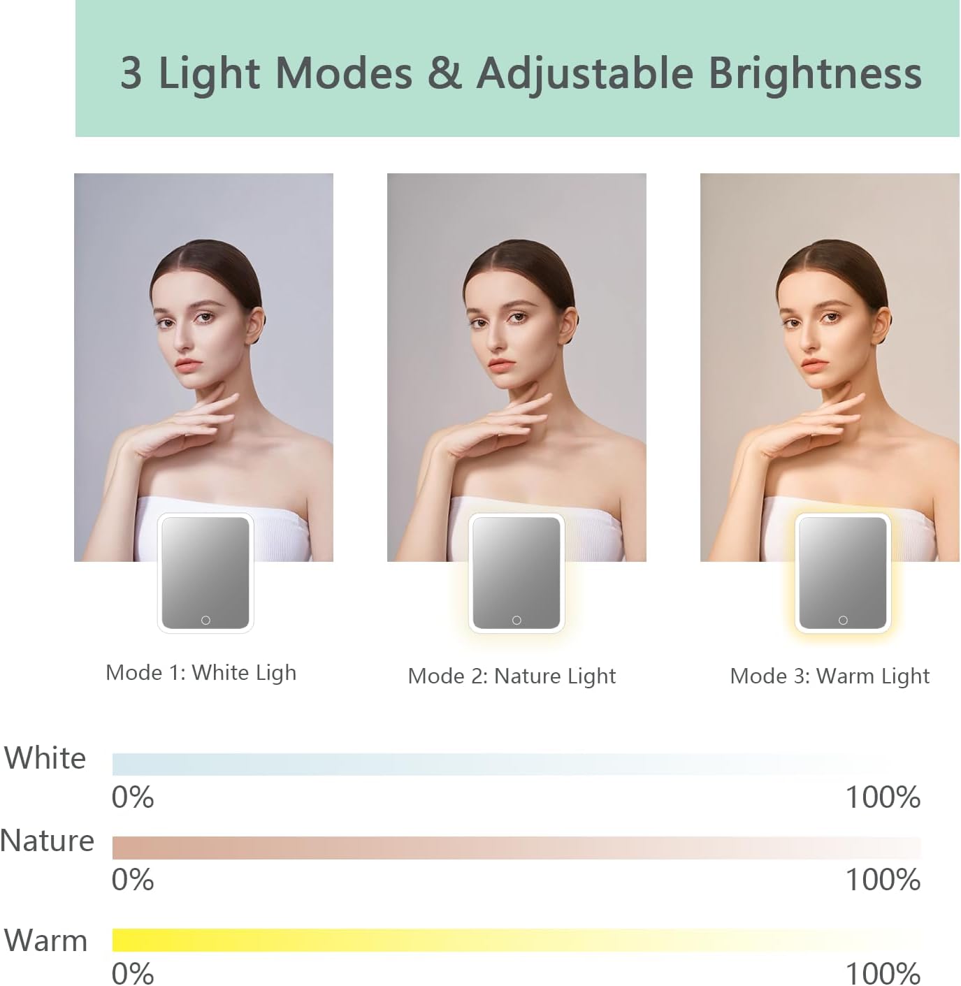 - 【makeup bag with led mirror】travel makeup bag is made of pu leather, waterproof and resistant, easy to clean.the travel makeup bag with of led light 3 color setting. 0-100% adjustable brightness that can be switched. with a long press on the switch, and a short press can adjust the color temperature between cool, natural and warm light.the make up bag can protect your cosmetics well, whether you are traveling or be away on official business, you can take your dresser everywhere.