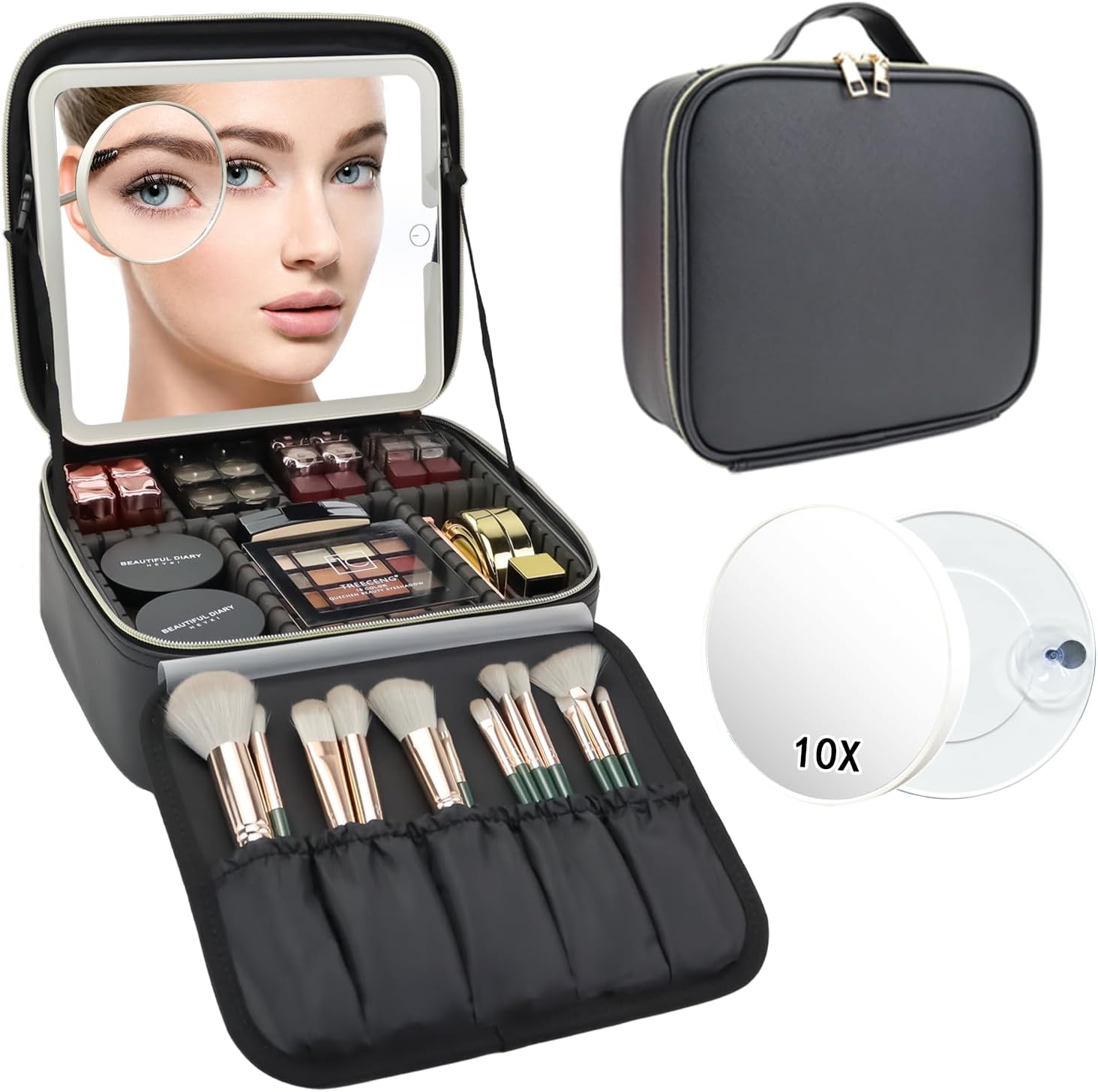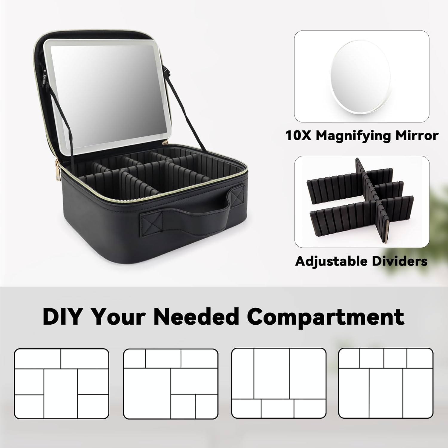 Travel Makeup Bag with LED Mirror and 10x magnifying glass with 3 Lighted Settings, Adjustable Dividers and Makeup Brush Storage Bag Black