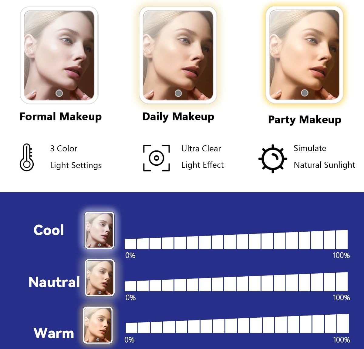 - Removable & Adjustable Brightness High Definition LED mirror:the travel makeup bag with vanity mirror of led light 3 color setting and 10x Magnifying Mirror. and 0-100% adjustable brightness that can be switched. With a long press on the switch, and a short press can adjust the color temperature between cool, natural and warm light.can be disassembled for separate use, and the makeup mirror comes with a separate stand that can be conveniently placed on the table according to your needs.