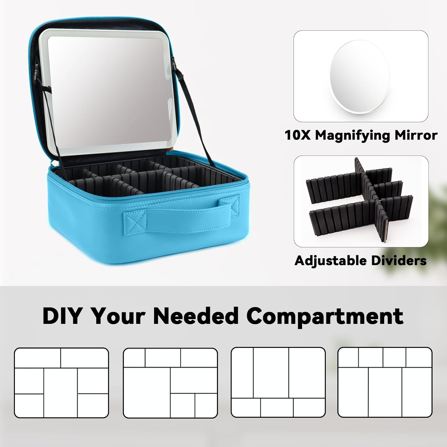 Travel Makeup Bag with LED Mirror and 10x magnifying glass with 3 Lighted Settings, Adjustable Dividers and Makeup Brush Storage Bag Blue
