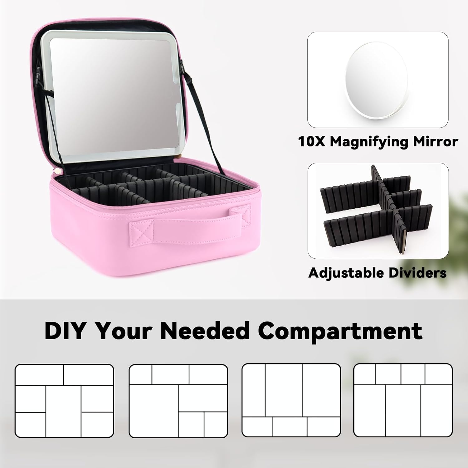 Travel Makeup Bag with LED Mirror and 10x magnifying glass with 3 Lighted Settings, Adjustable Dividers and Makeup Brush Storage Bag Light Pink