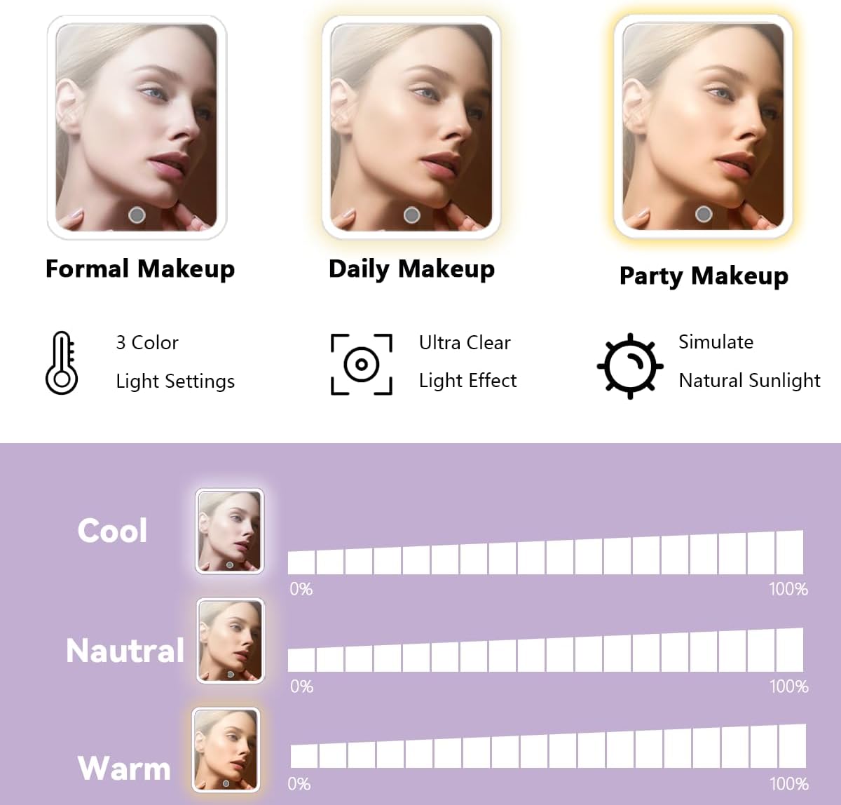 - Removable & Adjustable Brightness High Definition LED mirror:the travel makeup bag with vanity mirror of led light 3 color setting and 10x Magnifying Mirror. and 0-100% adjustable brightness that can be switched. With a long press on the switch, and a short press can adjust the color temperature between cool, natural and warm light.can be disassembled for separate use, and the makeup mirror comes with a separate stand that can be conveniently placed on the table according to your needs.