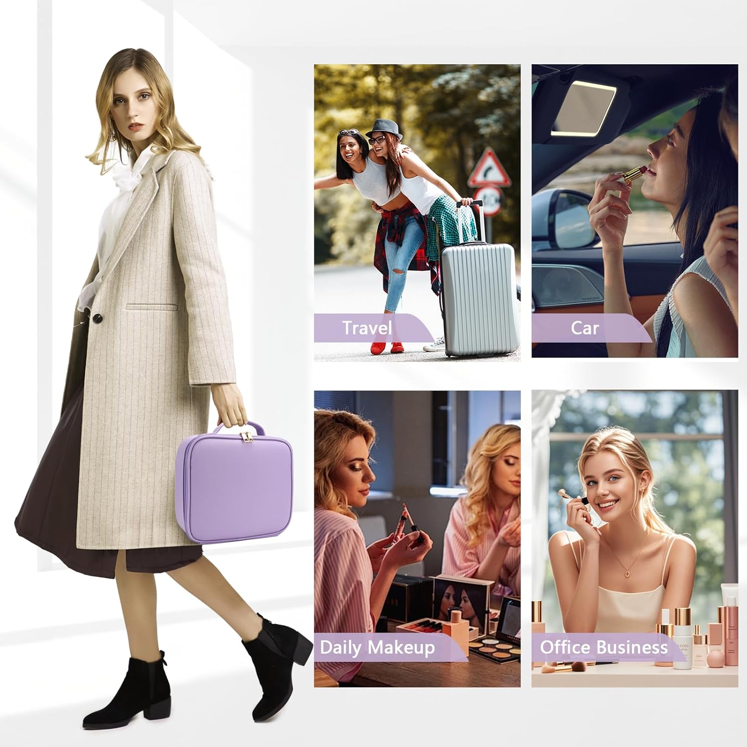 Travel Makeup Bag for Makeup Artists Large Makeup Case,with Mirror 3 Color Setting and Detachable 10x Magnifying Mirror Travel Makeup Bag,Portable Storage and Adjustable Dividers(Purple)
