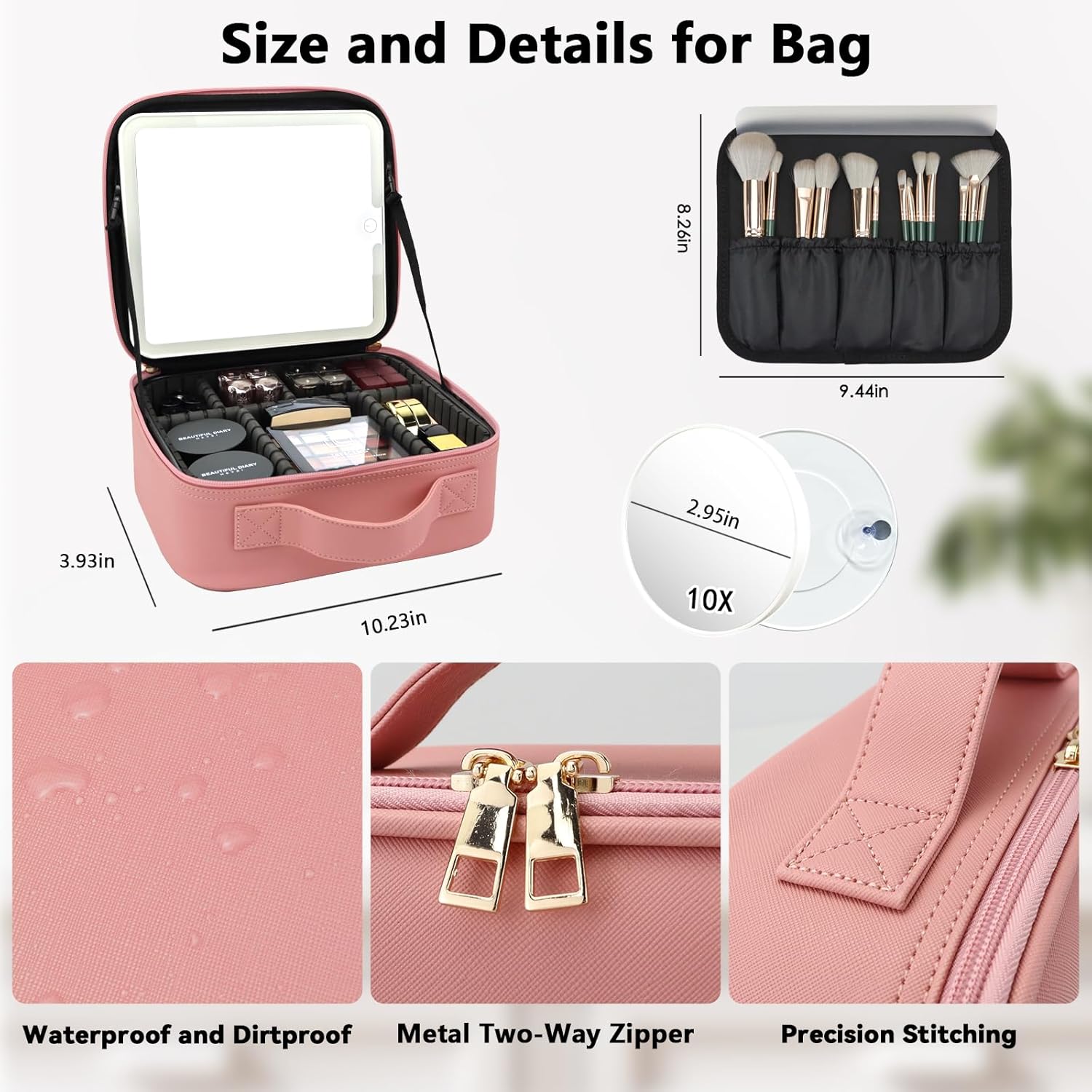 Travel Makeup Bag with LED Mirror and 10x magnifying glass with 3 Lighted Settings, Adjustable Dividers and Makeup Brush Storage Bag Pink