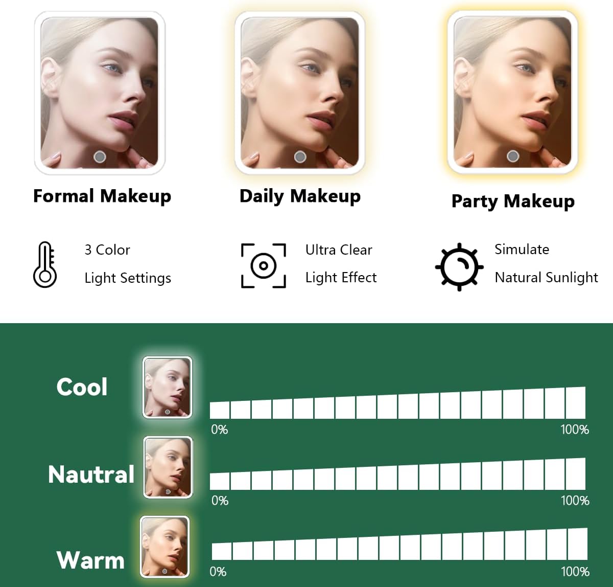 - Removable & Adjustable Brightness High Definition LED mirror:the travel makeup bag with vanity mirror of led light 3 color setting and 10x Magnifying Mirror. and 0-100% adjustable brightness that can be switched. With a long press on the switch, and a short press can adjust the color temperature between cool, natural and warm light.can be disassembled for separate use, and the makeup mirror comes with a separate stand that can be conveniently placed on the table according to your needs.