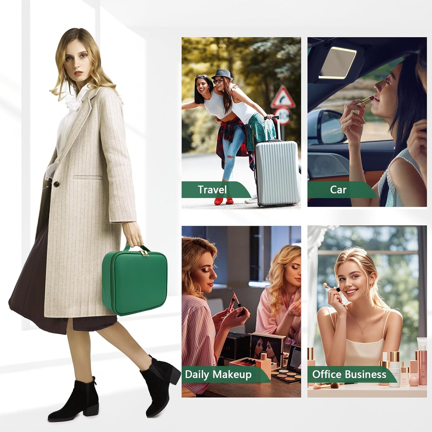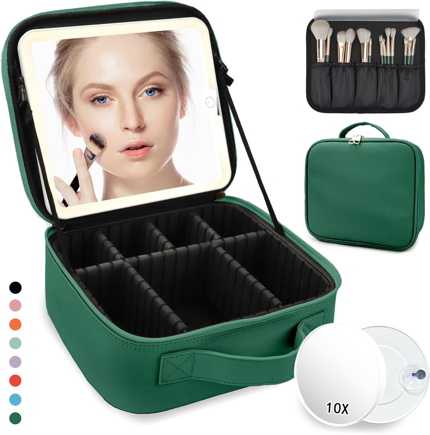 Travel Makeup Bag,with Mirror 3 Color Setting and Detachable 10x Magnifying Mirror Travel Makeup Bag,Portable Storage and Adjustable Dividers(Dark green)
