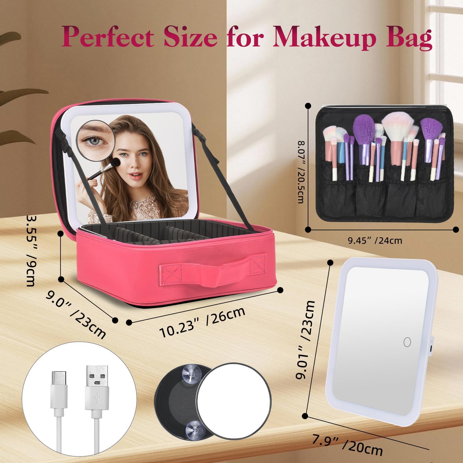 - 10X Magnifier & Rechargeable Makeup Mirror:The 3.5-inch 10x magnifying mirror makes makeup travel bag easy to touch up your makeup and handle makeup details such as applying eyeliner, mascara, wearing contact lenses, and trimming facial hair and eyebrows. The travel cosmetic bag has a built-in 2000mAh rechargeable lithium battery. Based on 30 minutes of makeup time per day, a single charge can last for about a week, eliminating battery life concerns