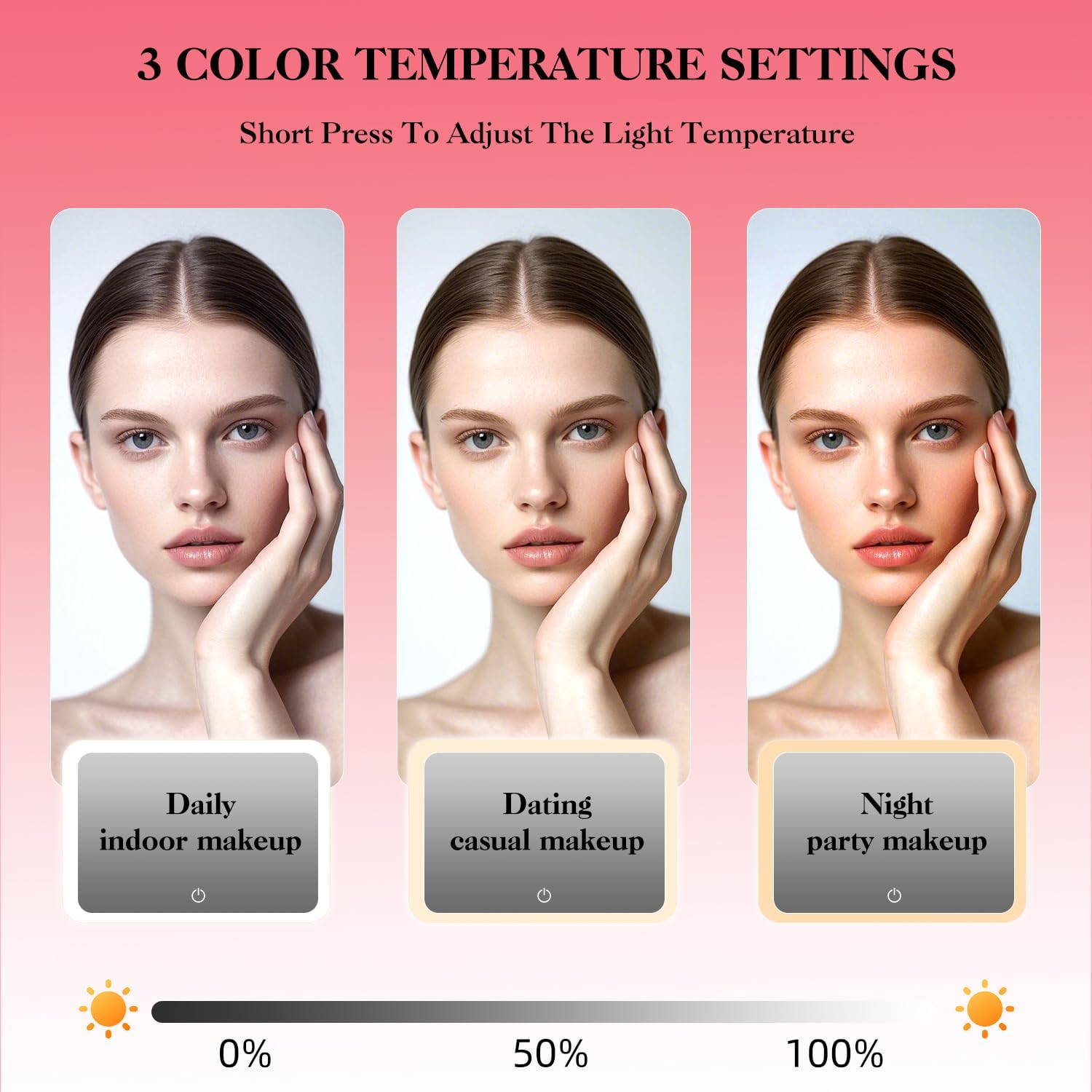 - 3-color Adjustable Light with Makeup Mirror:Simply press the switch to easily adjust the color temperature and switch between cool light, natural light, and warm light to meet the makeup needs of different occasions. Press and hold the switch to adjust the brightness of the light. Whether it's early morning or dusk, makeup bag with led mirror can create the perfect natural lighting effect to ensure that every makeup look is flawless