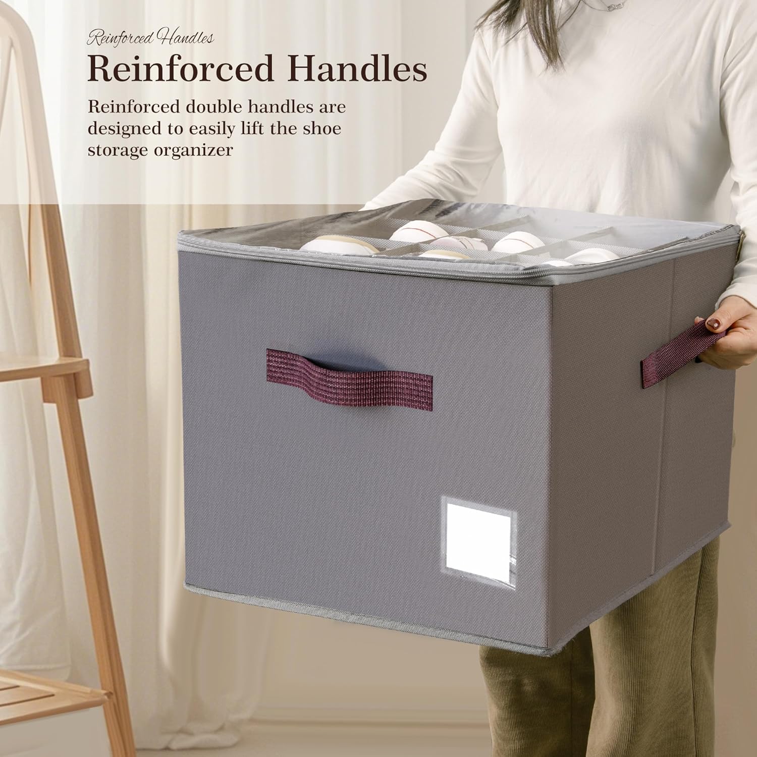 - Durable Construction: Our shoe organizer for closet features a sturdy zipper, three woven handles, and high-quality Oxford fabric to ensure long term use without tearing. Reinforced with two hard cardboard instead of fragile plastic, it maintains its shape and prevents deformation over time