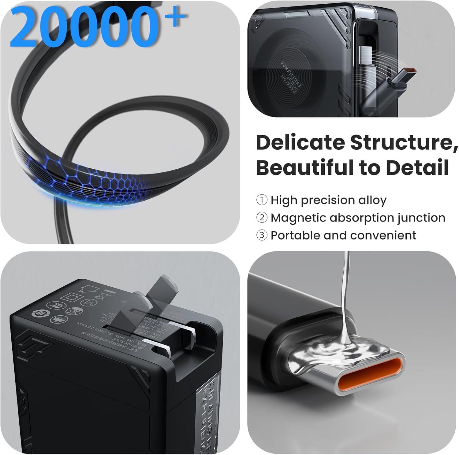 - ă28.7in Retractable Cable, No More Tangled MessăThis 65W fast charging adapter comes with a built-in 28.7in retractable Type-C cable. The 28.7in retractable Type-C cable extends smoothly and retracts with a gentle tug, keeping your bag tangle-freeâperfect for on-the-go, bedside, or desk use. Its flat and elongated design slips easily into backpacks or suitcases. Note: Includes an extra 39.3in braided data cable for dual-port simultaneous charging